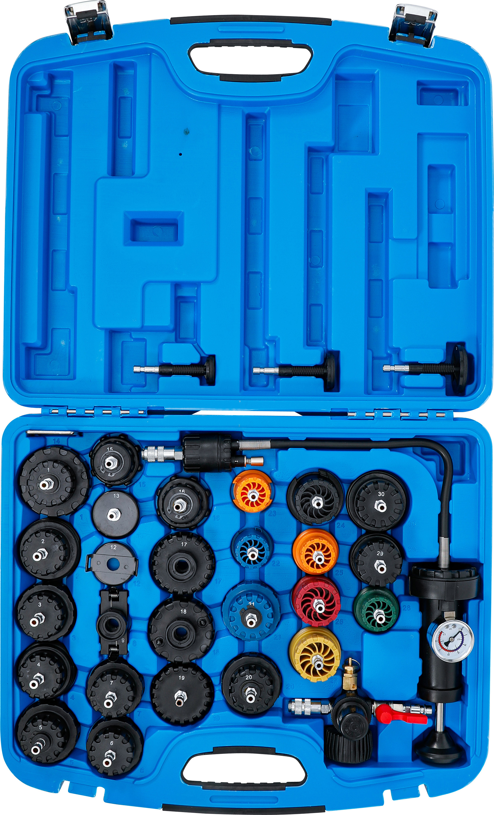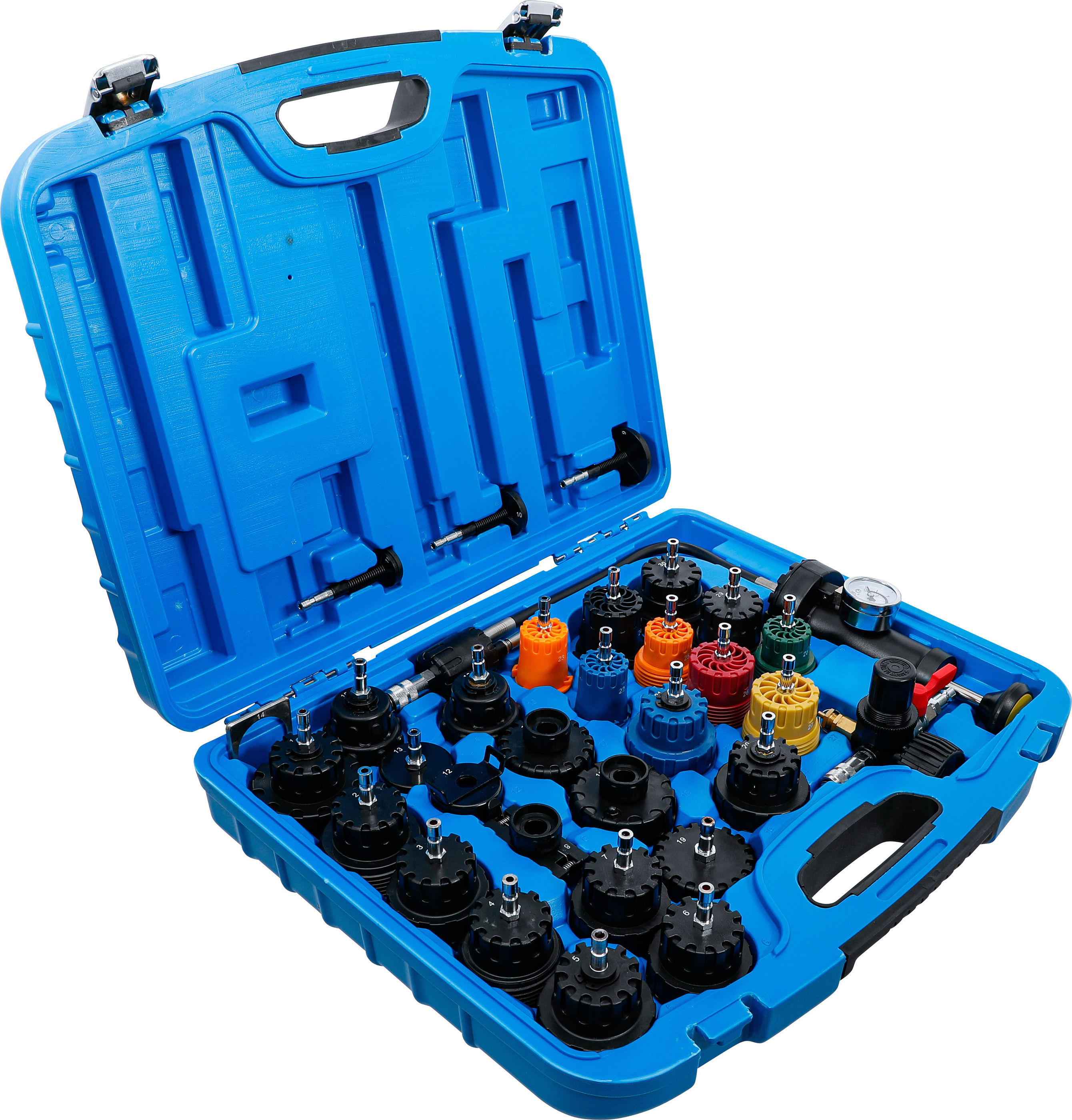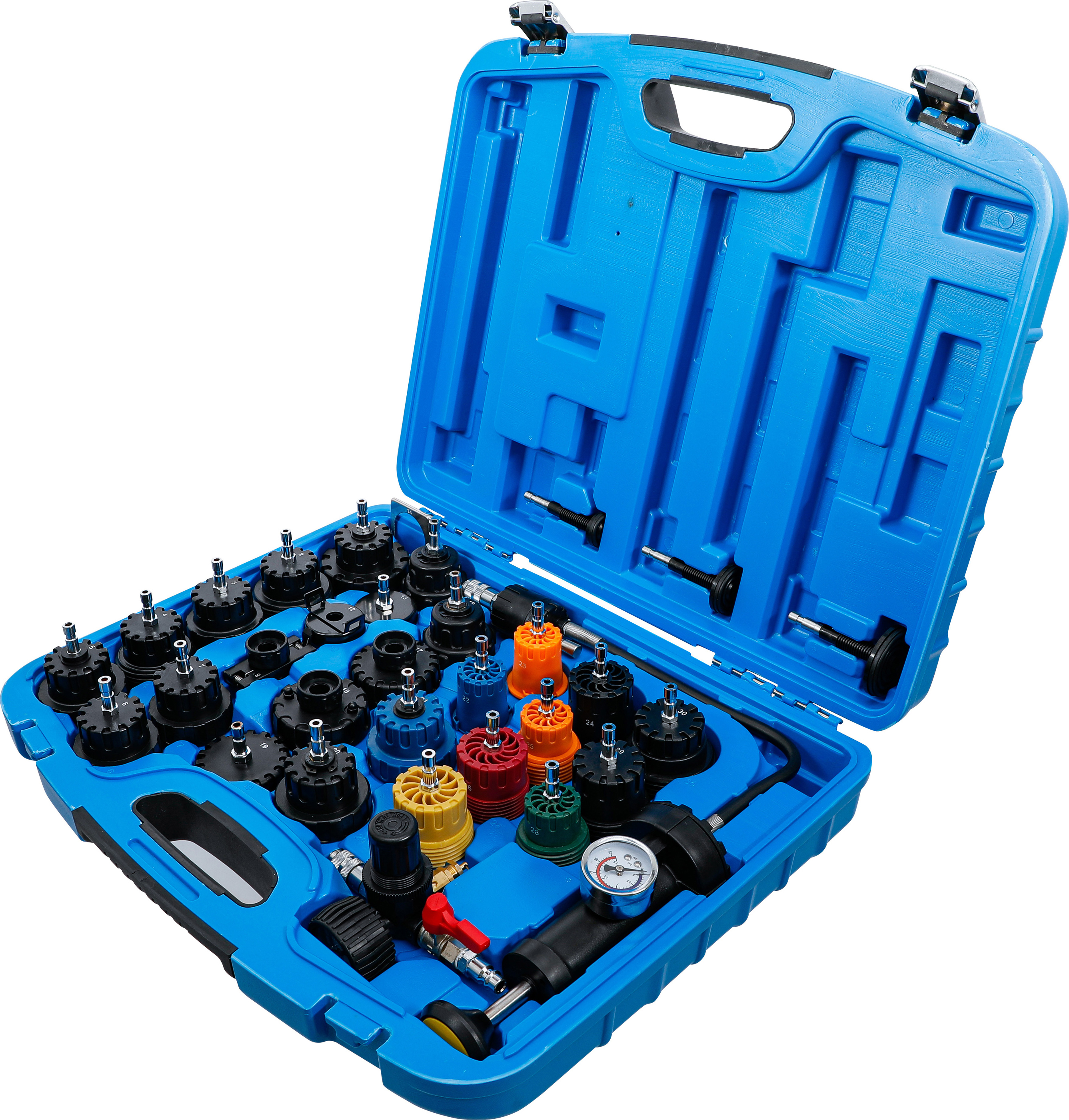 Der 32-teilige Kühlsystem-Abdrück-Satz ist ein professionelles Werkzeugset zum schnellen und präzisen Auffinden von Leckagen im Kühlsystem. Dank der beiliegenden Adapter ist das System vielseitig einsetzbar und passend für zahlreiche Fahrzeugmarken und -modelle. Mit der Handpumpe oder einem Druckluftsystem lässt sich der Kühldruck gezielt aufbauen, um Undichtigkeiten effizient zu lokalisieren. Die beiden Messbereiche von bis zu 2,5 bar (Handpumpe) und 5 bar (Druckluftregler) bieten maximale Kontrolle für präzise Testergebnisse.