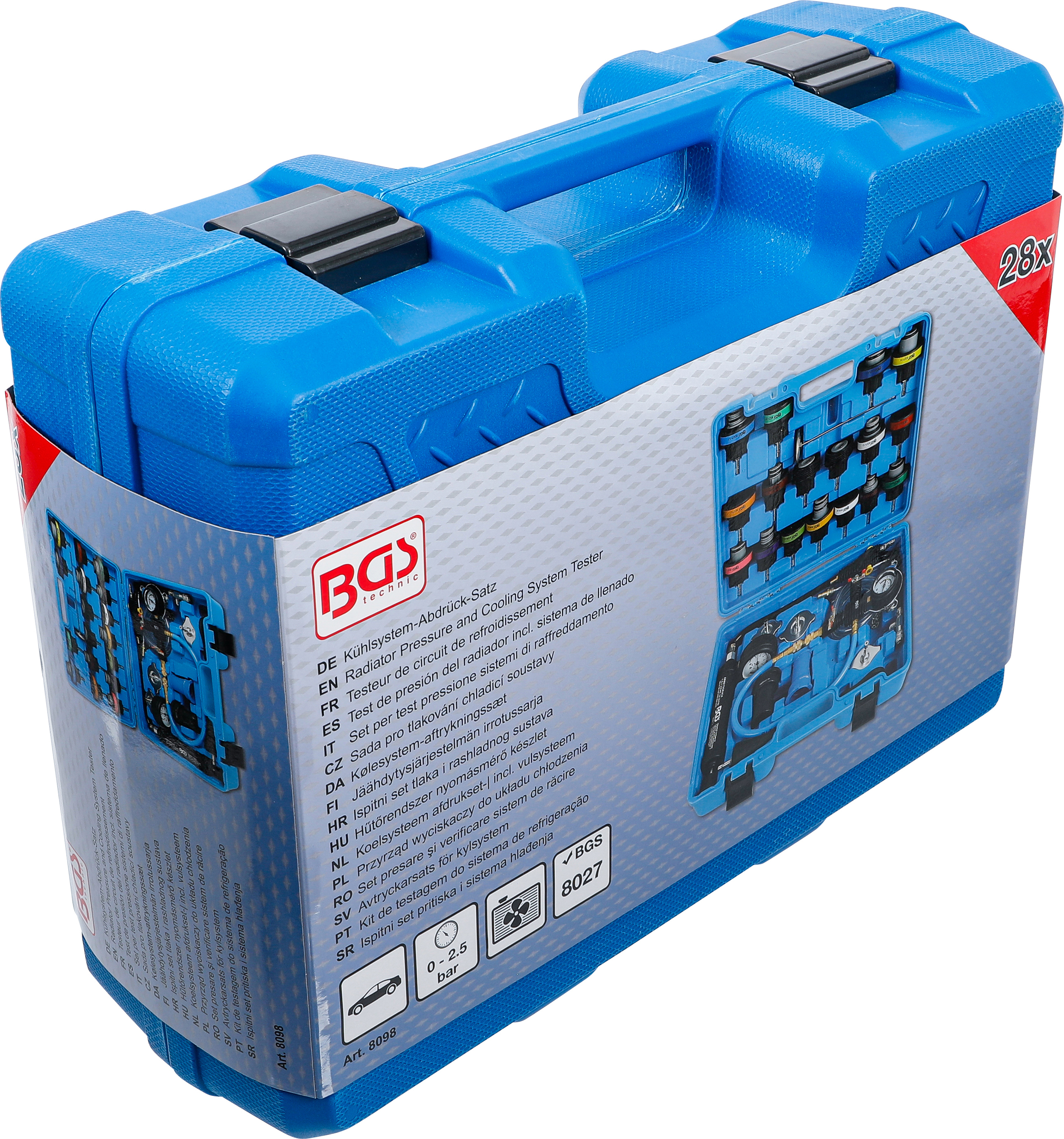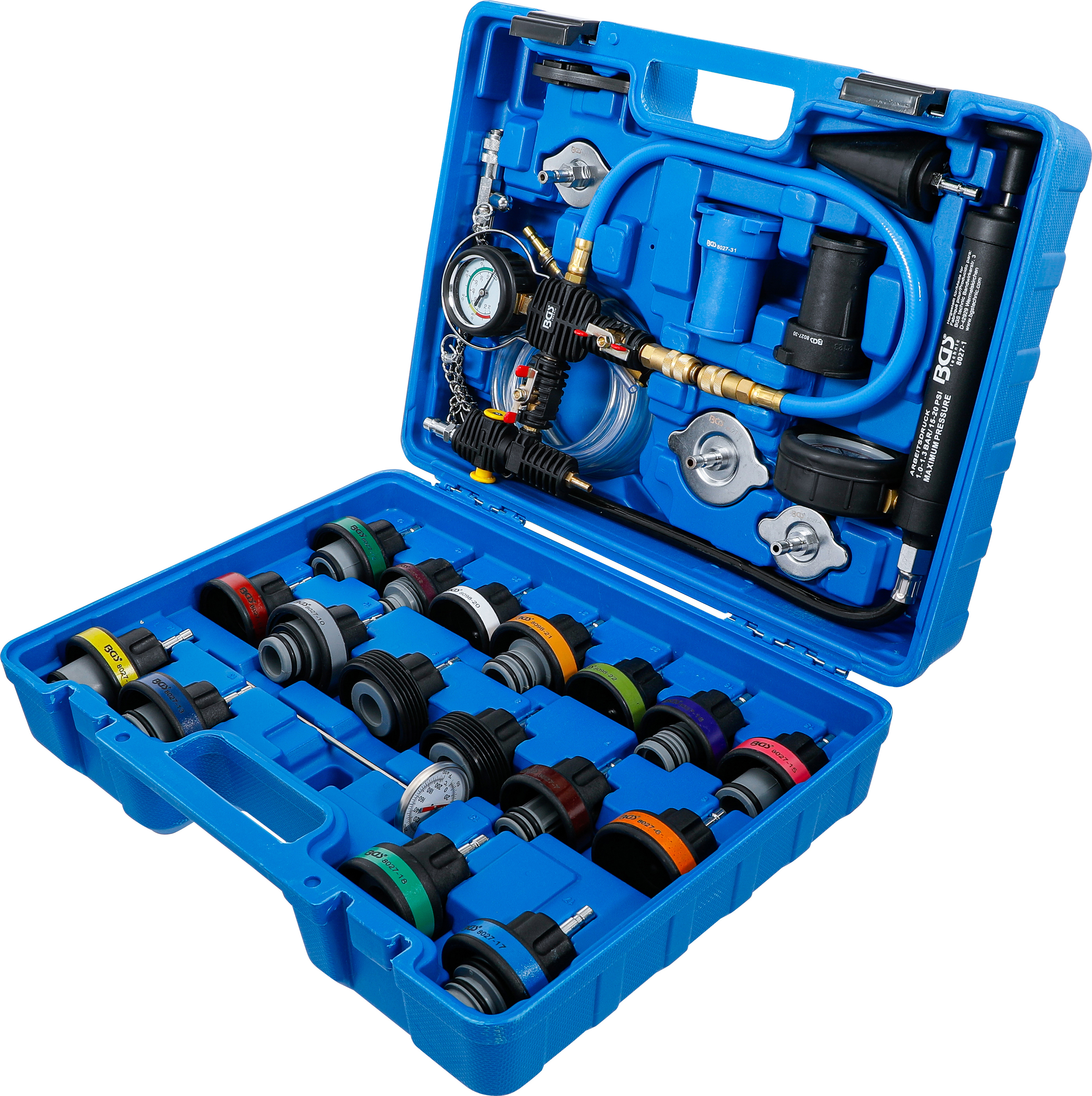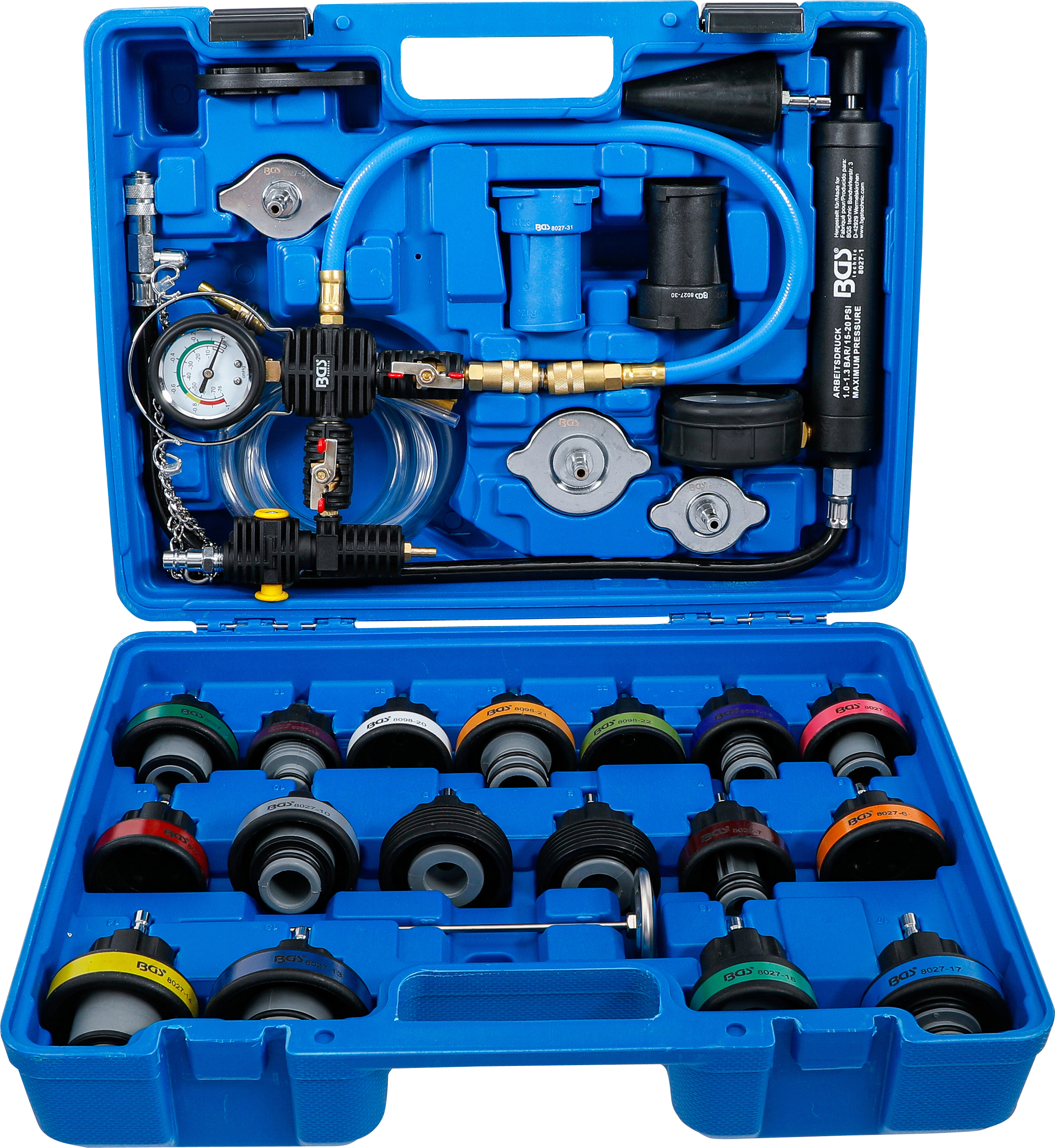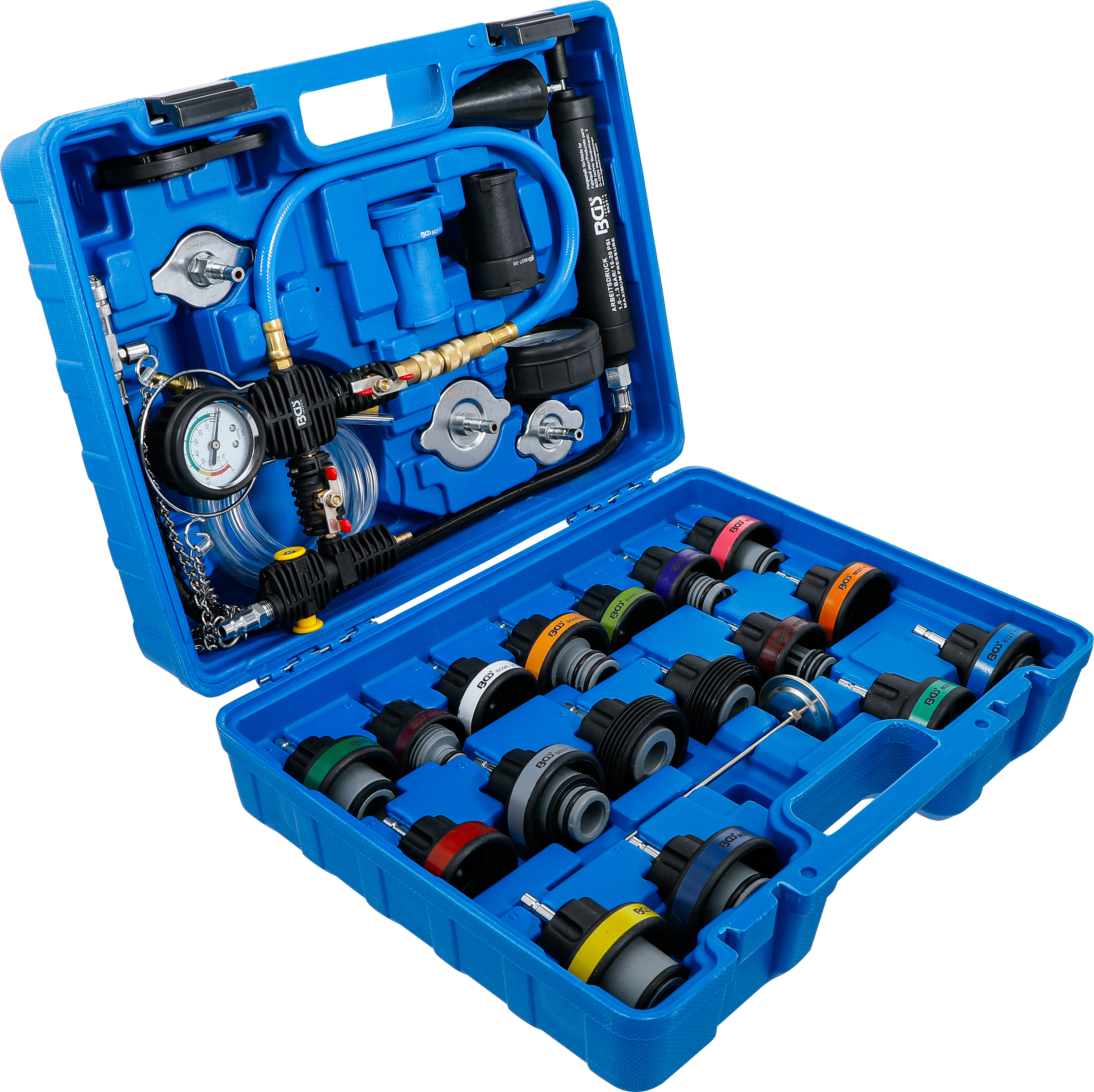 Der 28-teilige Kühlsystem-Abdrück-Satz inkl. Befüllsystem ermöglicht Ihnen eine schnelle und professionelle Prüfung des Kühlsystems auf Undichtigkeiten sowie eine saubere Befüllung mit Kühlmittel. Dank seiner umfassenden Adapterauswahl ist das Set passend für zahlreiche Fahrzeugtypen und somit ideal für Werkstätten, Kfz-Profis und ambitionierte Hobbyschrauber geeignet. Der Messbereich von 0 bis 2,5 bar mit einer geringen Toleranz von +/- 2 % sorgt für eine präzise Druckprüfung, um undichte Stellen zuverlässig zu erkennen. Das integrierte Befüllsystem ermöglicht das saubere Nachfüllen und Entlüften des Kühlsystems, was den Wartungsprozess erheblich erleichtert und Zeit spart.