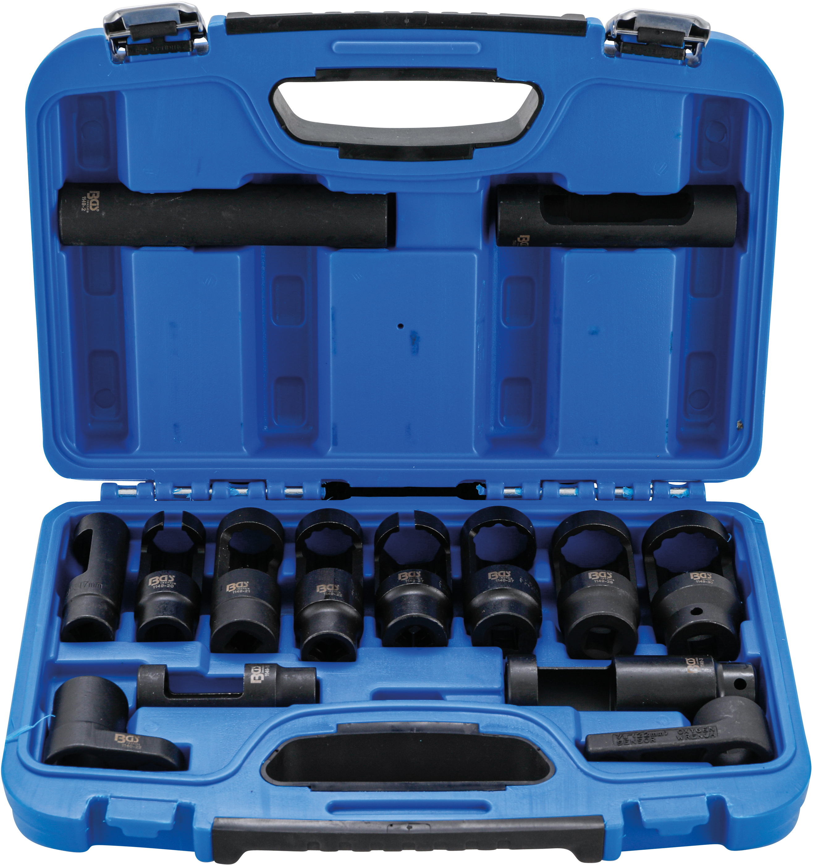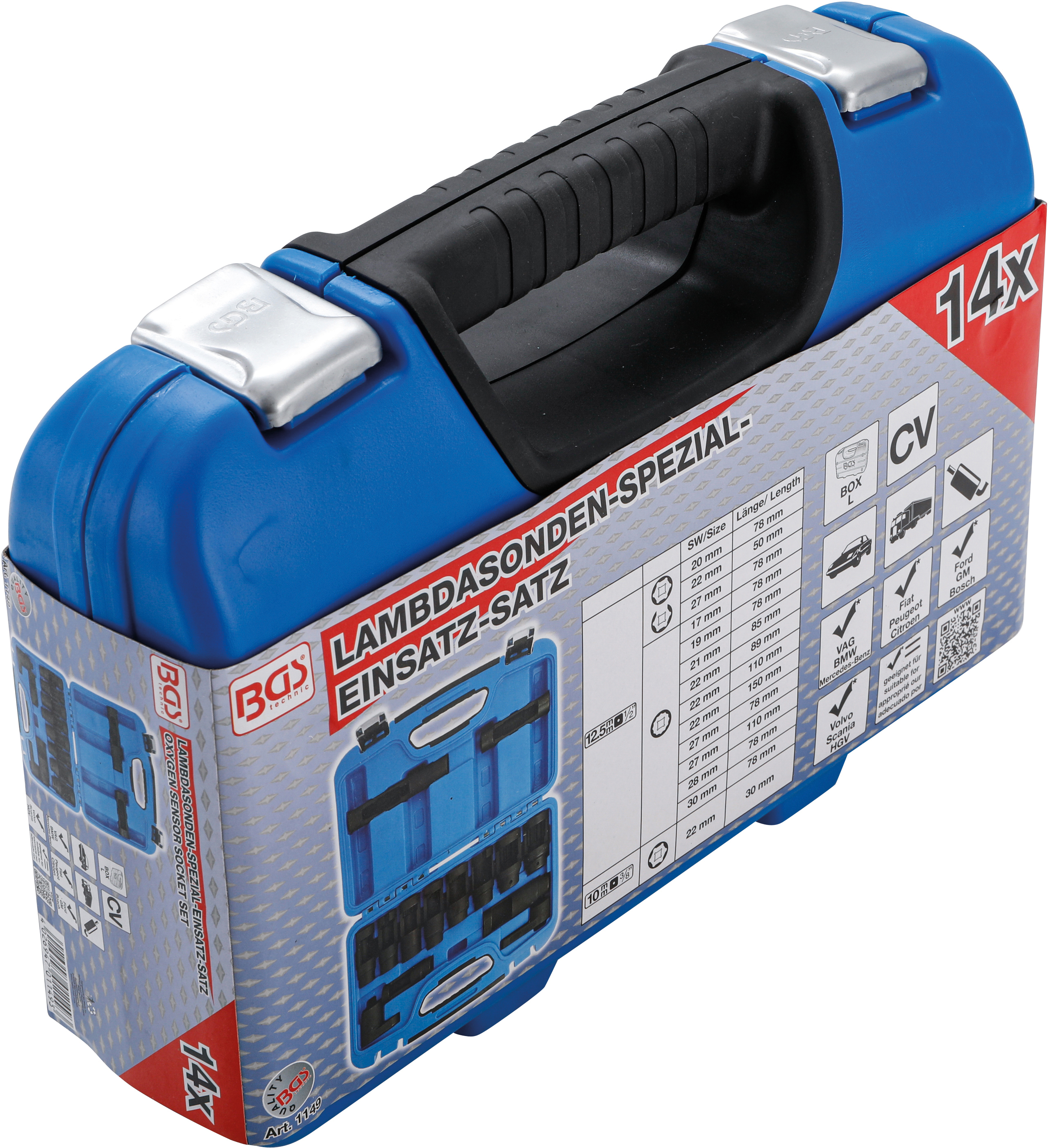 - 14 verschiedene Lambdasonden-Spezial-Einsätze mit Innenvierkant 12,5 mm (1/2") bzw. 10 mm (3/8")