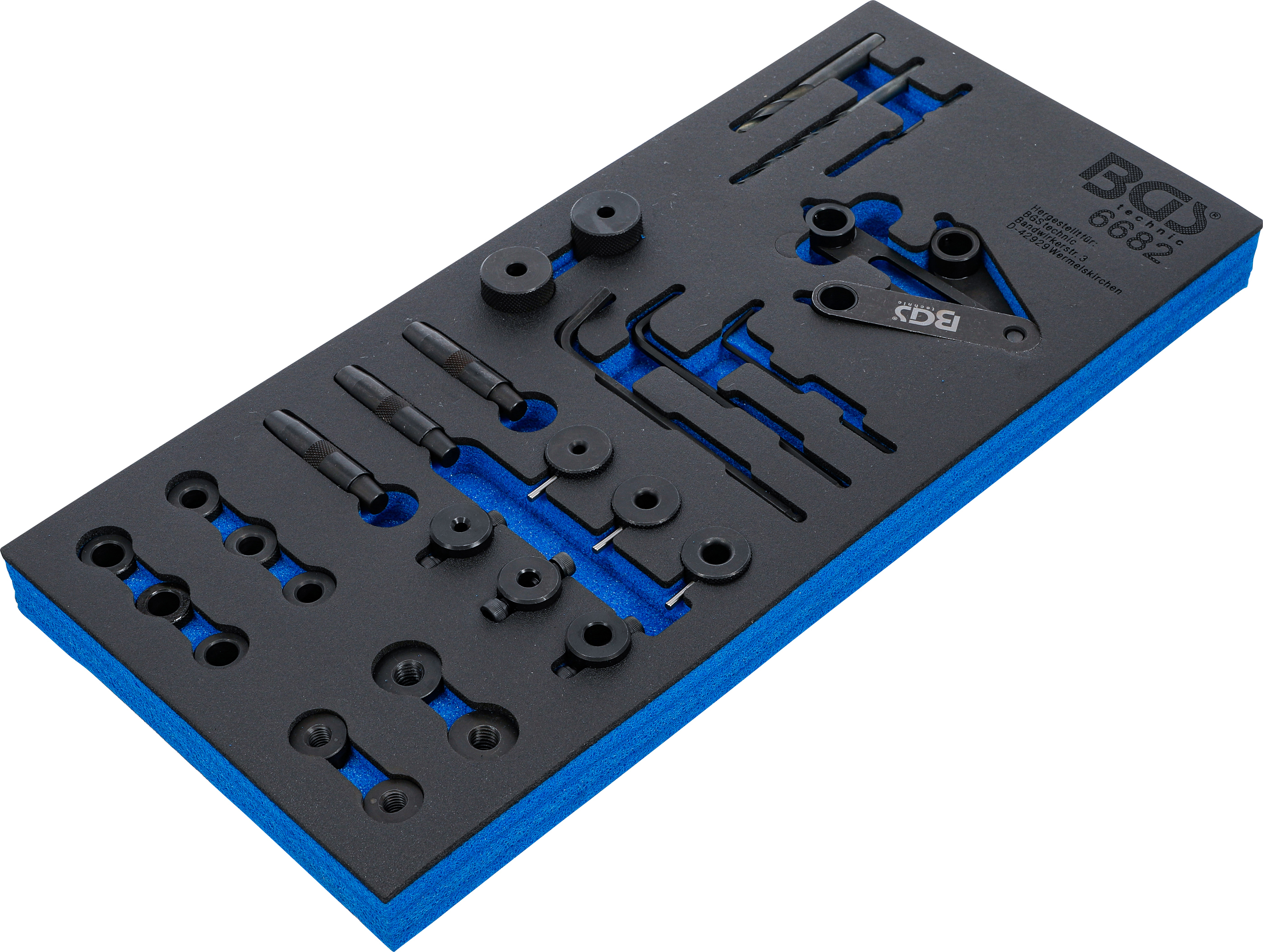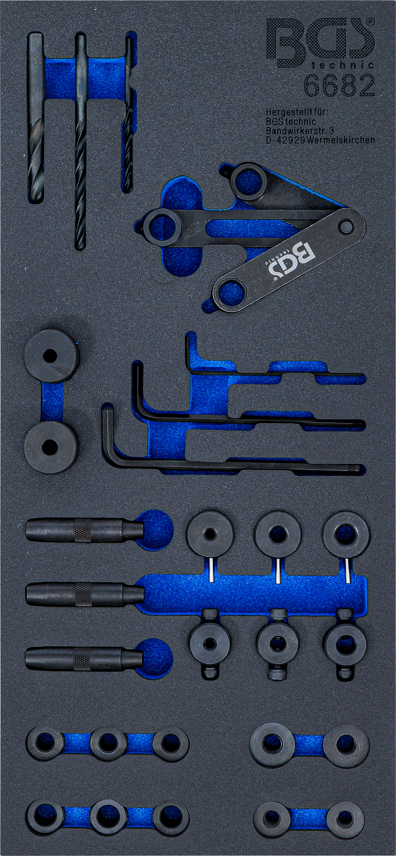 Die hochwertige Werkstattwageneinlage 1/3 mit 28-teiligem Zylinderkopf-Bohrlehren-Werkzeug-Satz wurde speziell für präzises Arbeiten beim Ausbohren von abgebrochenen oder ausgerissenen M8 und M10 Stehbolzen sowie Schrauben entwickelt. Sie eignet sich ideal für den professionellen Einsatz an Verschraubungen von Auspuffkrümmern, Ansaugbrücken, Zylinderköpfen, Getrieben und Differentialen. Auch für Arbeiten an Motoren und Gehäusen von Pkw, Motorrädern und Nutzfahrzeugen ist dieses Bohrlehren-Set bestens geeignet.