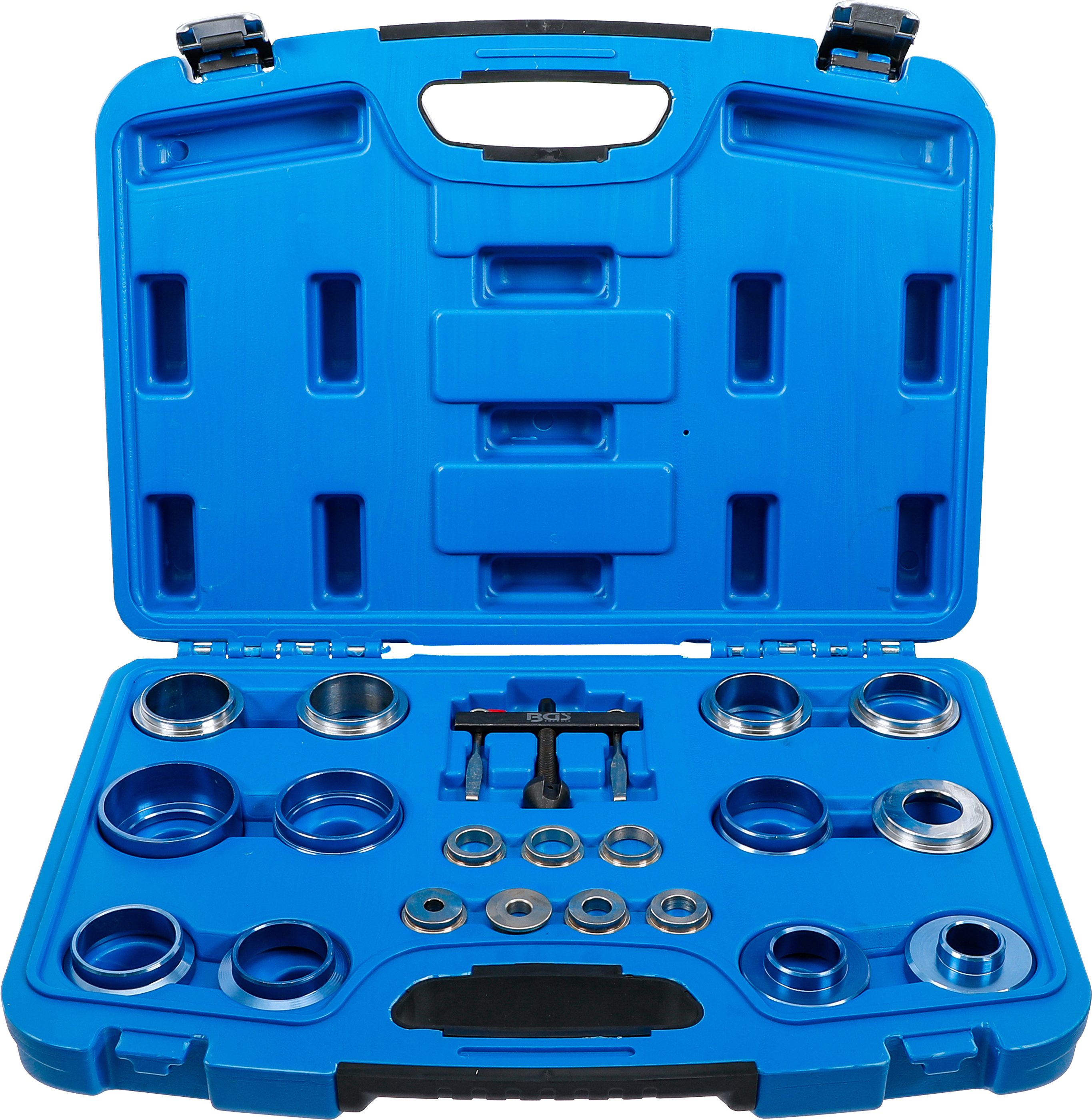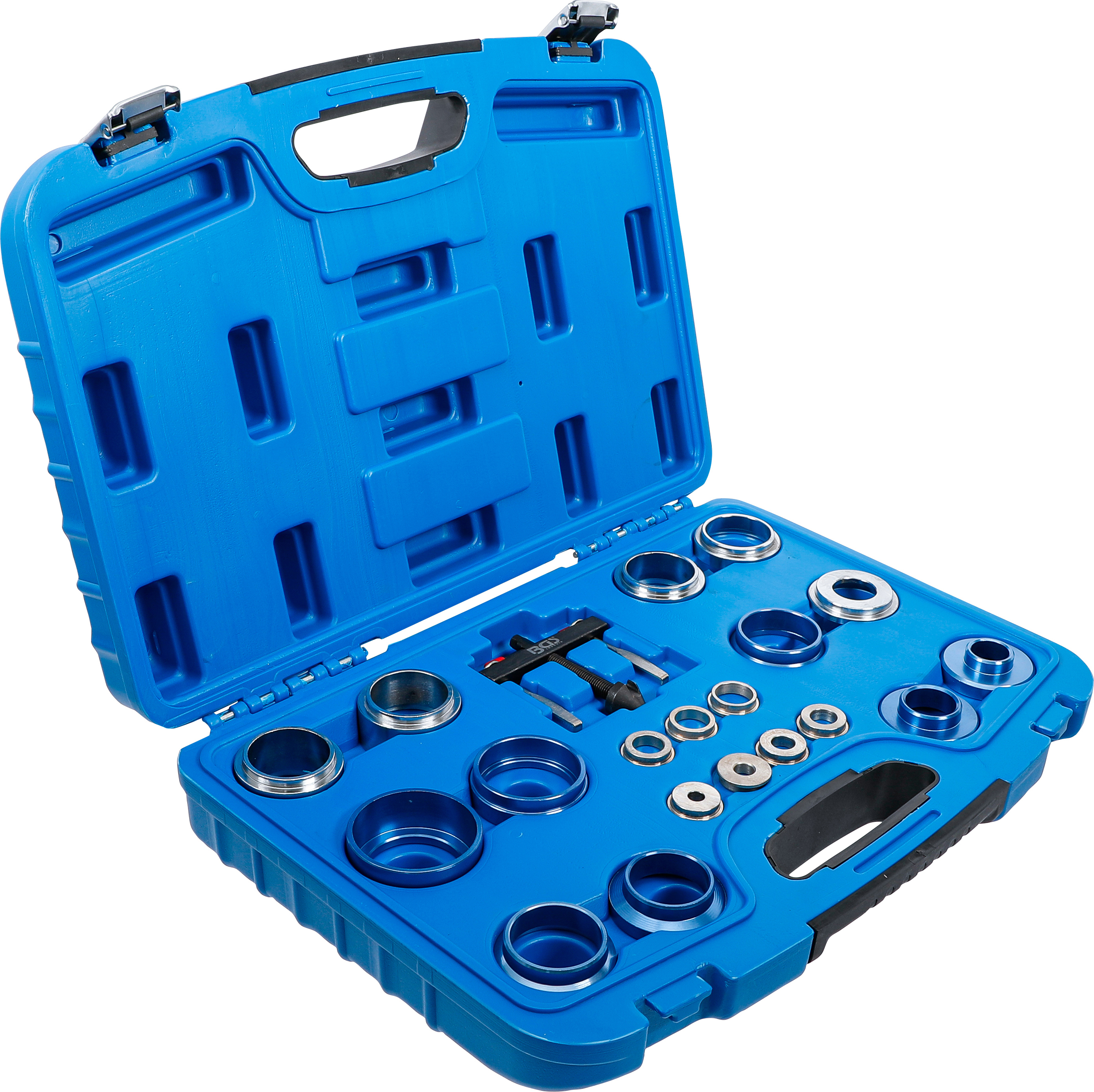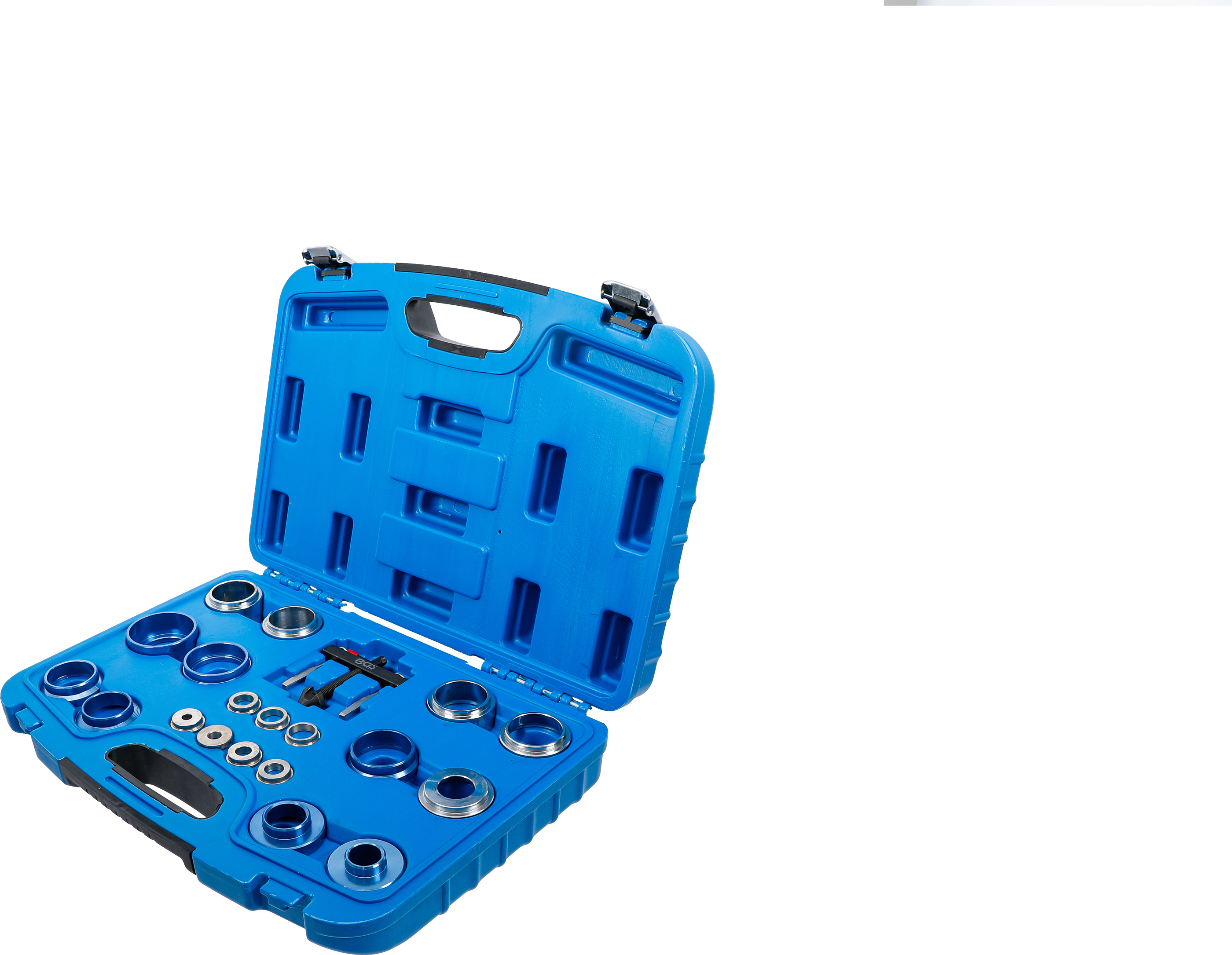 Das Set ist ideal, um Radialdichtringe an Nocken-, Kurbel- und Ausgleichswellen präzise einzusetzen oder zu entfernen. Dank der im Lieferumfang enthaltenen Distanzringe können unterschiedliche Längen bei Zentralschrauben komfortabel ausgeglichen werden. Die sieben Druckstücke ermöglichen ein sauberes Einpressen der Dichtringe, während die Adapterringe für verschiedene Zentralschrauben (M8 – M20) maximale Flexibilität bieten. Mit dem 2-Klauenabzieher lassen sich selbst festsitzende Dichtringe bis zu einer Tiefe von 35 mm zuverlässig lösen.