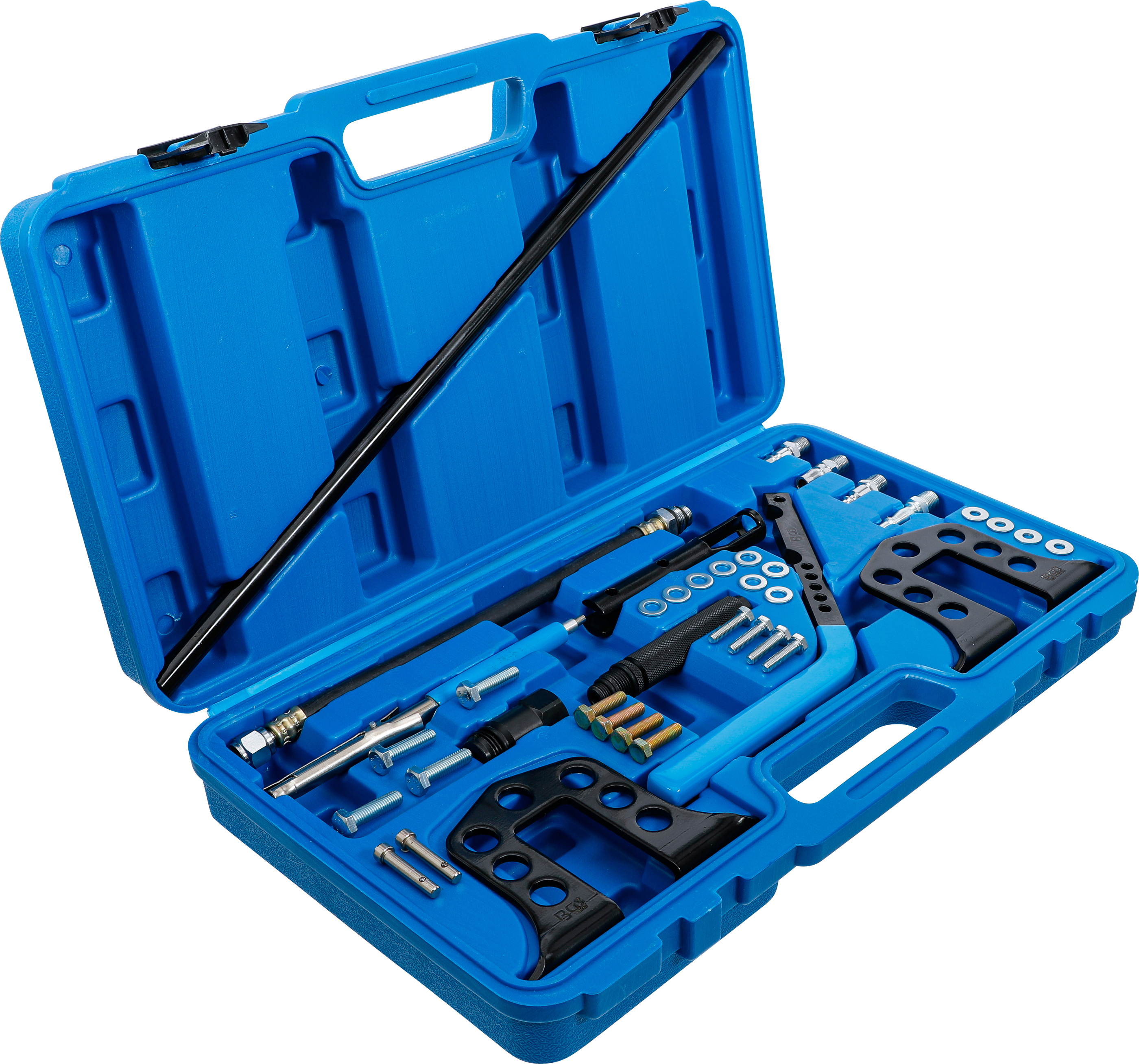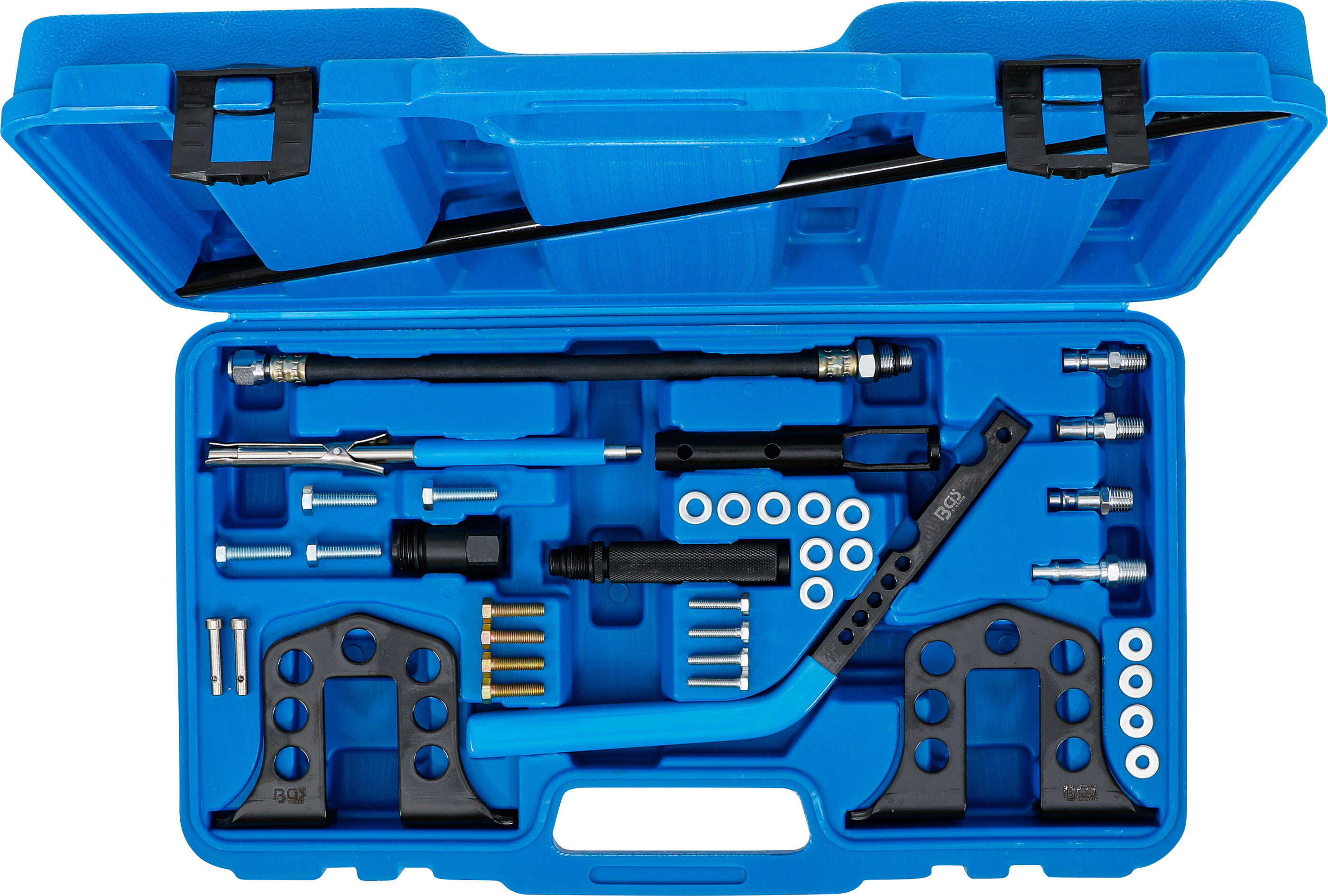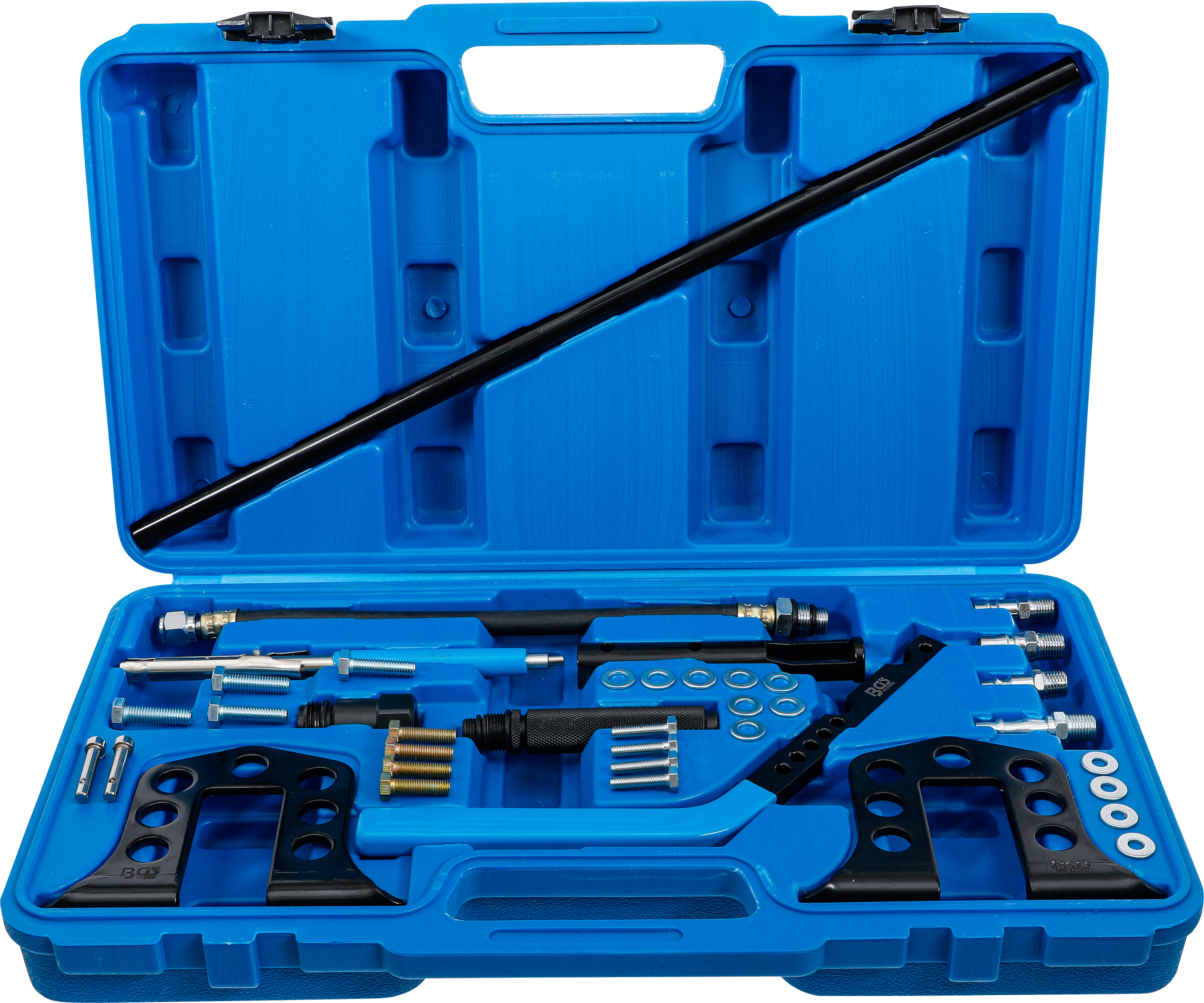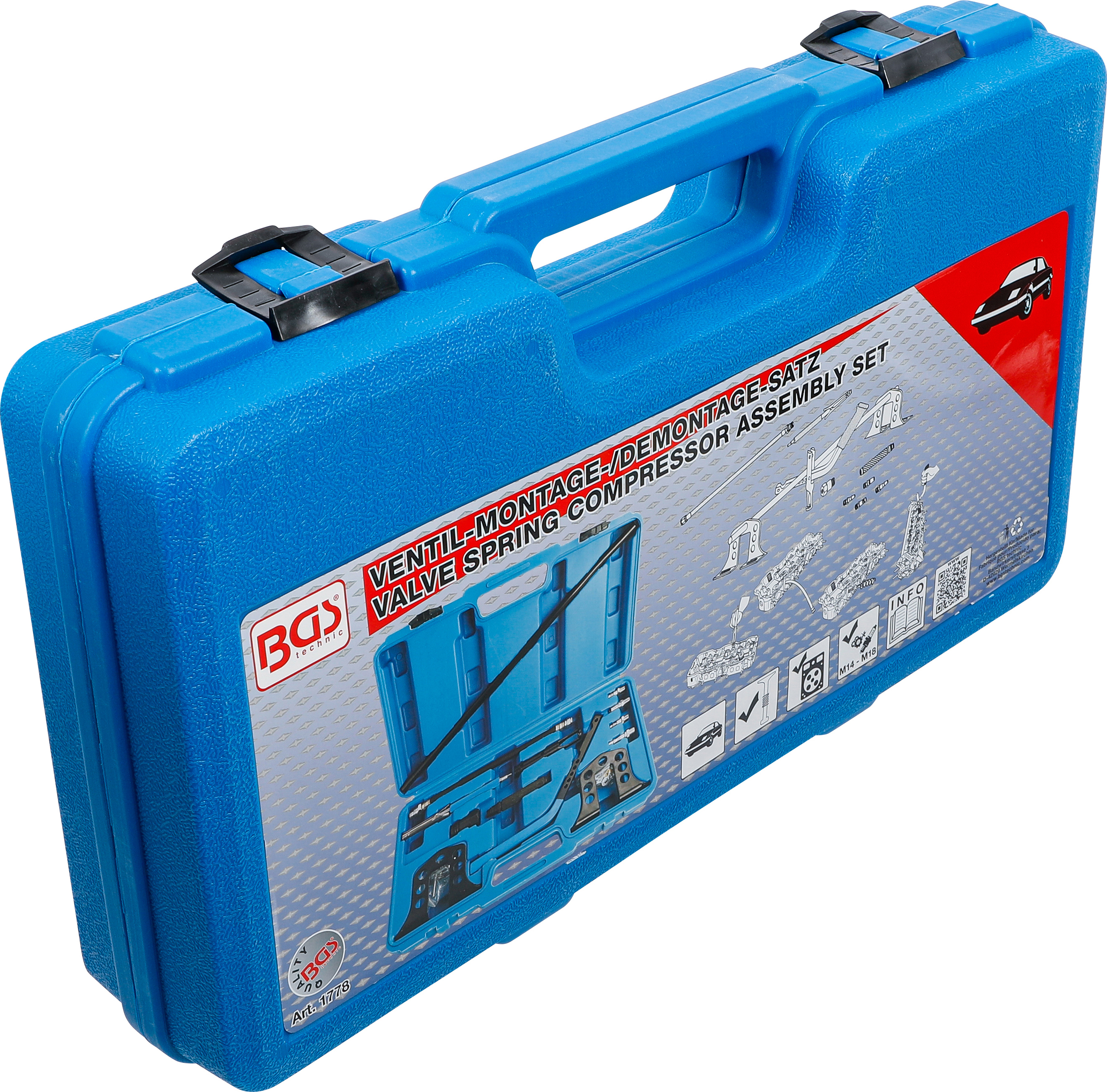 Der BGS Ventil-Montage-/Demontage-Satz ist das ideale Werkzeugset, um Ventilfedern sicher zu montieren oder zu demontieren. Mit diesem 13-teiligen Set können Sie Ventilschaftdichtungen wechseln, ohne den Zylinderkopf zu demontieren – das spart Zeit und Aufwand. Dank des mitgelieferten Druckschlauchs kann der Zylinder bequem mit Pressluft befüllt werden, um die Ventile in Position zu halten. Das Set ist passend für M14- und M18-Zündkerzengewinde und enthält zusätzlich ein Ventilkeil-Montagewerkzeug. Die maximale Breite des Werkzeugs beträgt 515 mm, was eine flexible Anwendung an verschiedenen Motoren ermöglicht.