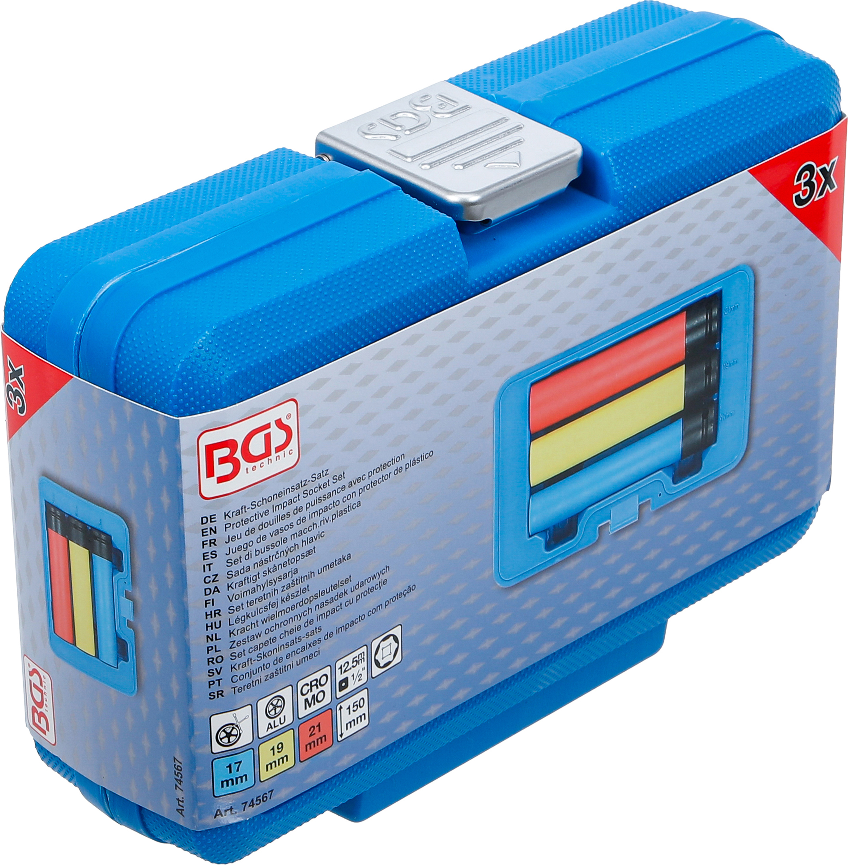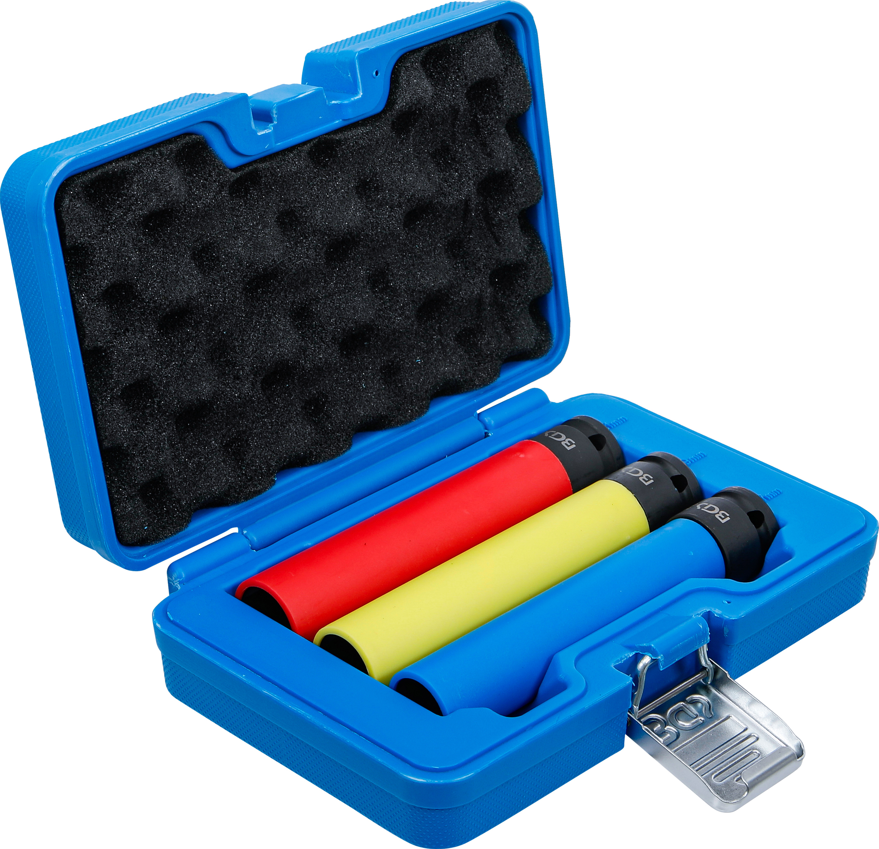 Der BGS Kraft-Schoneinsatz-Satz extra tief ist die ideale Lösung, wenn Sie Radmuttern sicher und professionell lösen oder anziehen möchten, ohne empfindliche Alufelgen zu beschädigen. Der Satz eignet sich sowohl für den Handbetrieb als auch für Schlagschrauber und bietet dank des robusten Aufnahmesystems mit Arretierstift und Gummiring maximale Stabilität beim Arbeiten. Der Kunststoffeinsatz und der Kunststoffmantel schützen Felgen zuverlässig vor Kratzern oder Druckstellen. Die farbliche Codierung der einzelnen Größen sorgt für ein schnelles Auffinden im Arbeitsalltag. Durch die extra lange Ausführung bleibt ausreichend Abstand zum Kotflügel, wodurch Arbeiten an tiefliegenden Radschrauben noch komfortabler werden. Gefertigt ist das Set aus hochwertigem Chrom-Molybdän-Stahl mit einer Gesamtlänge von 150 mm je Einsatz. Der handliche Kunststoffkoffer ermöglicht eine sichere und ordentliche Aufbewahrung und sorgt dafür, dass Sie Ihre Werkzeuge immer griffbereit haben.