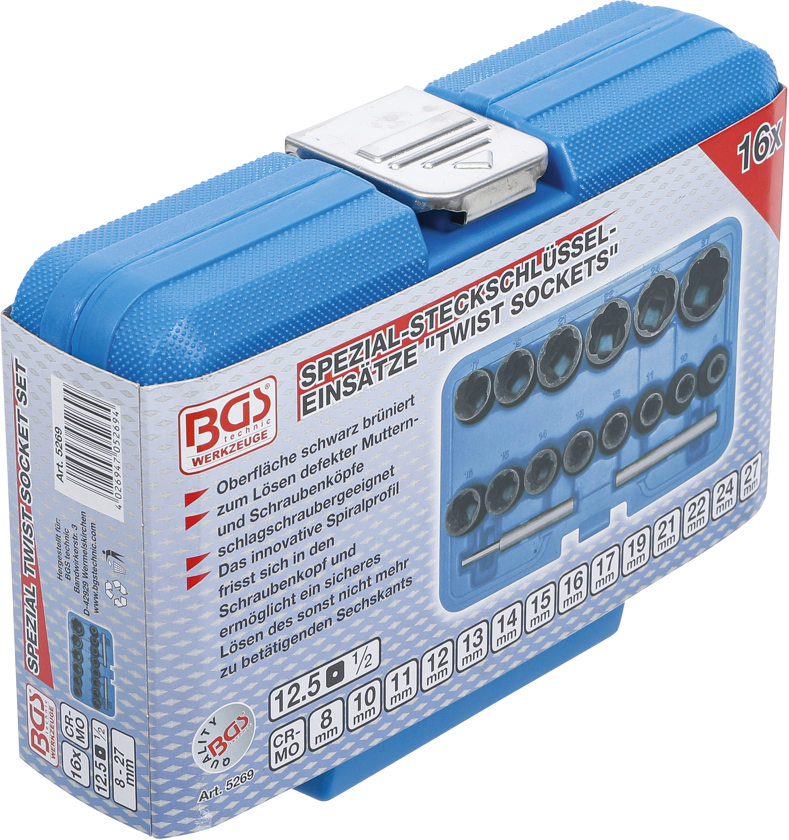 - 16 Spezial-Steckschlüssel-Einsätze/Schraubenausdreher, Antrieb Innenvierkant 12,5 mm (1/2"): SW 8, 10, 11, 12, 13, 14, 15, 16, 17, 19, 21, 22, 24, 27