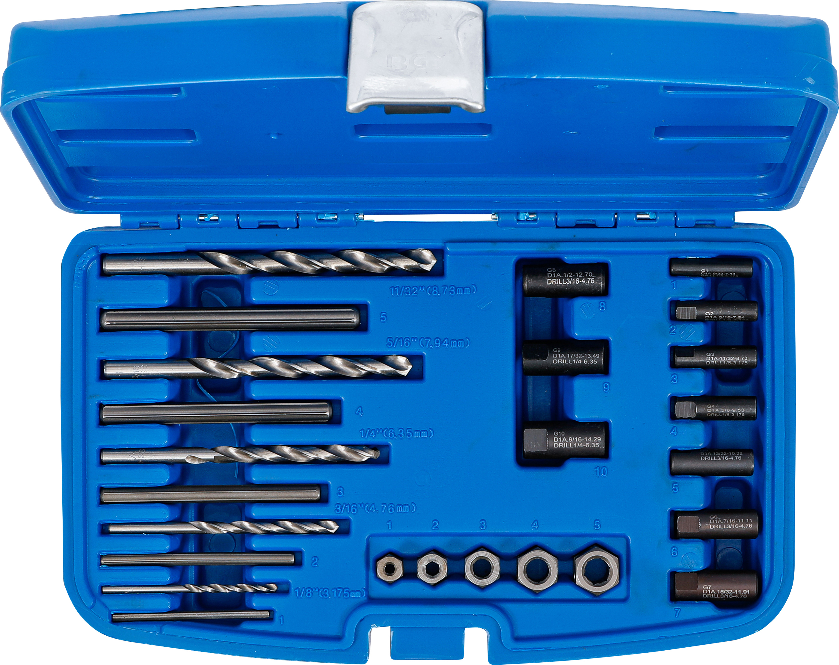 - 5 HSS Bohrer: 3,2 mm / 4,8 mm / 6,4 mm / 8,0 mm / 8,7 mm (rechtsdrehend)
