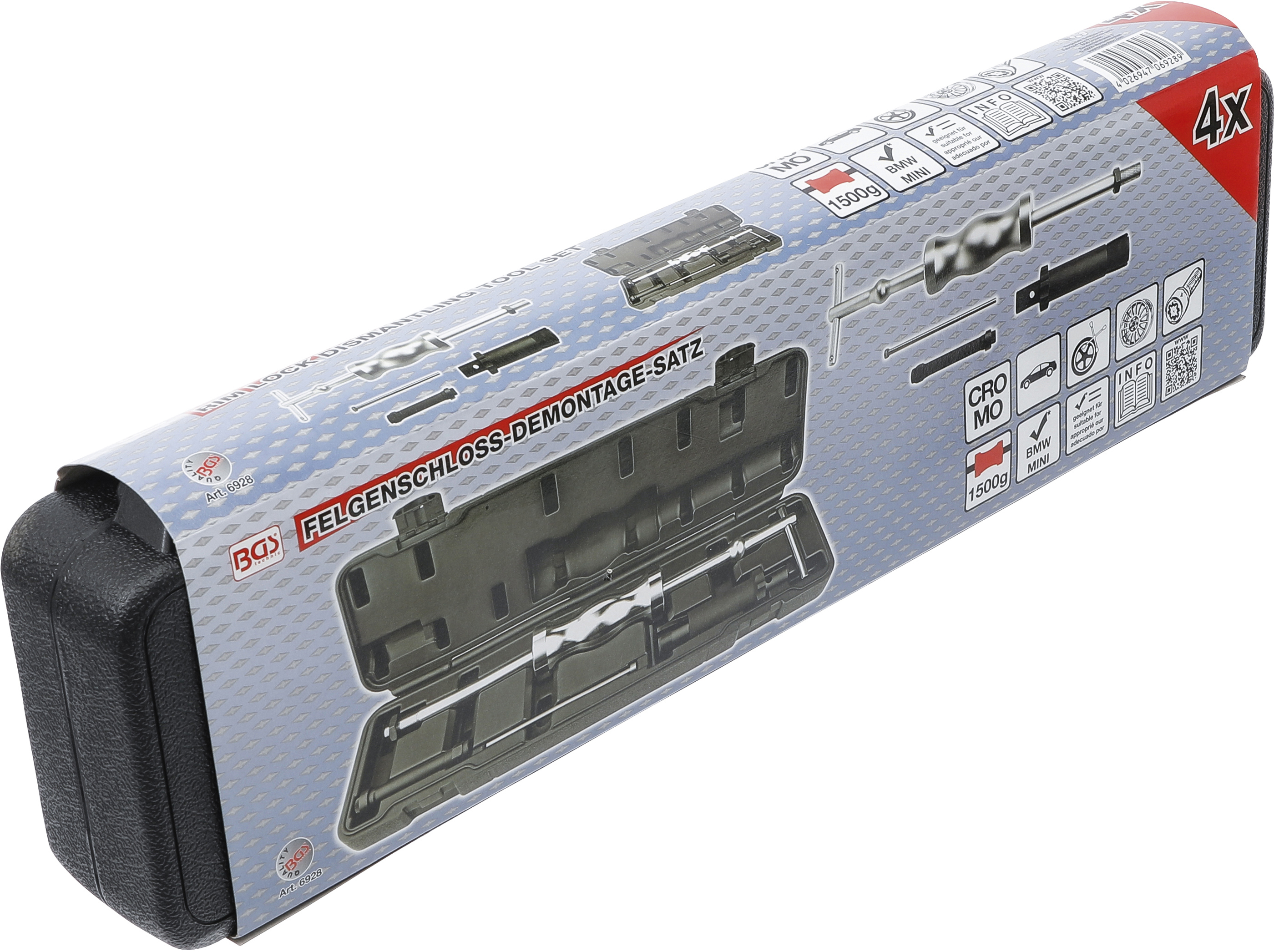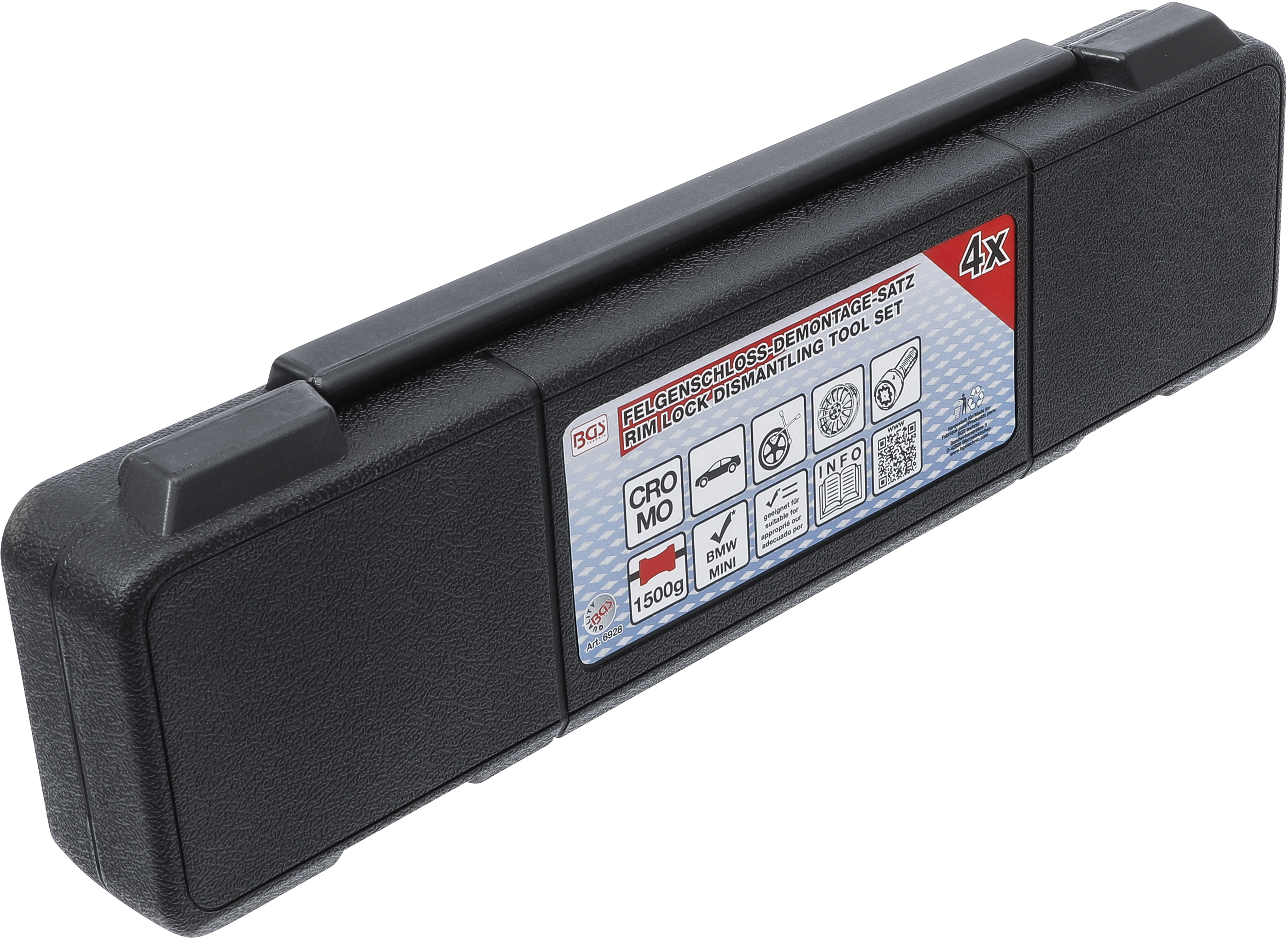 Der BGS Felgenschloss-Demontage-Satz ist das ideale Werkzeug, um festsitzende, rundgedrehte oder beschädigte Radsicherungsschrauben sicher zu entfernen. Er wurde speziell für Aluminium- und Stahlfelgen entwickelt und überzeugt durch seine robuste Fertigung aus hochwertigem S45C- und CRO-MO-Stahl. Damit ist das Set besonders langlebig und zuverlässig im täglichen Werkstatteinsatz.