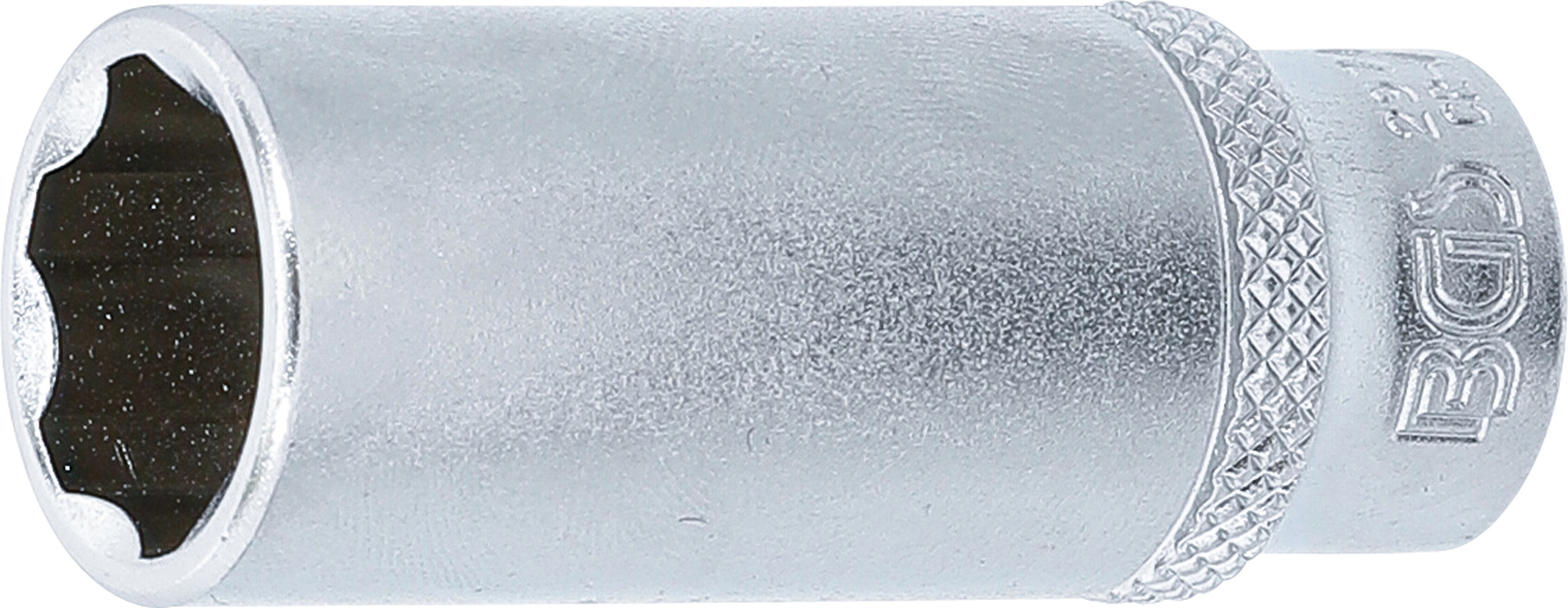 Der hochwertige BGS Steckschlüssel-Einsatz Super Lock in tiefer Ausführung wurde entwickelt, um eine sichere und präzise Kraftübertragung beim Lösen und Anziehen von Schrauben zu gewährleisten. Dank der Super Lock Wellenprofil-Geometrie greift der Einsatz optimal auf den Flanken der Schraubenmutter und minimiert so die Gefahr des Abrundens. Gefertigt aus robustem Chrom-Vanadium-Stahl bietet dieser Steckschlüssel-Einsatz eine hohe Lebensdauer und Stabilität im täglichen Werkstattgebrauch. Die matte, verchromte Oberfläche schützt zuverlässig vor Korrosion und sorgt für eine angenehme Haptik. Durch die Rändelung wird ein sicherer Griff auch bei öligen oder feuchten Händen ermöglicht. Der Einsatz ist für einen 6,3 mm (1/4 Zoll) Innenvierkant-Antrieb ausgelegt und hat eine Schlüsselweite von 14 mm.