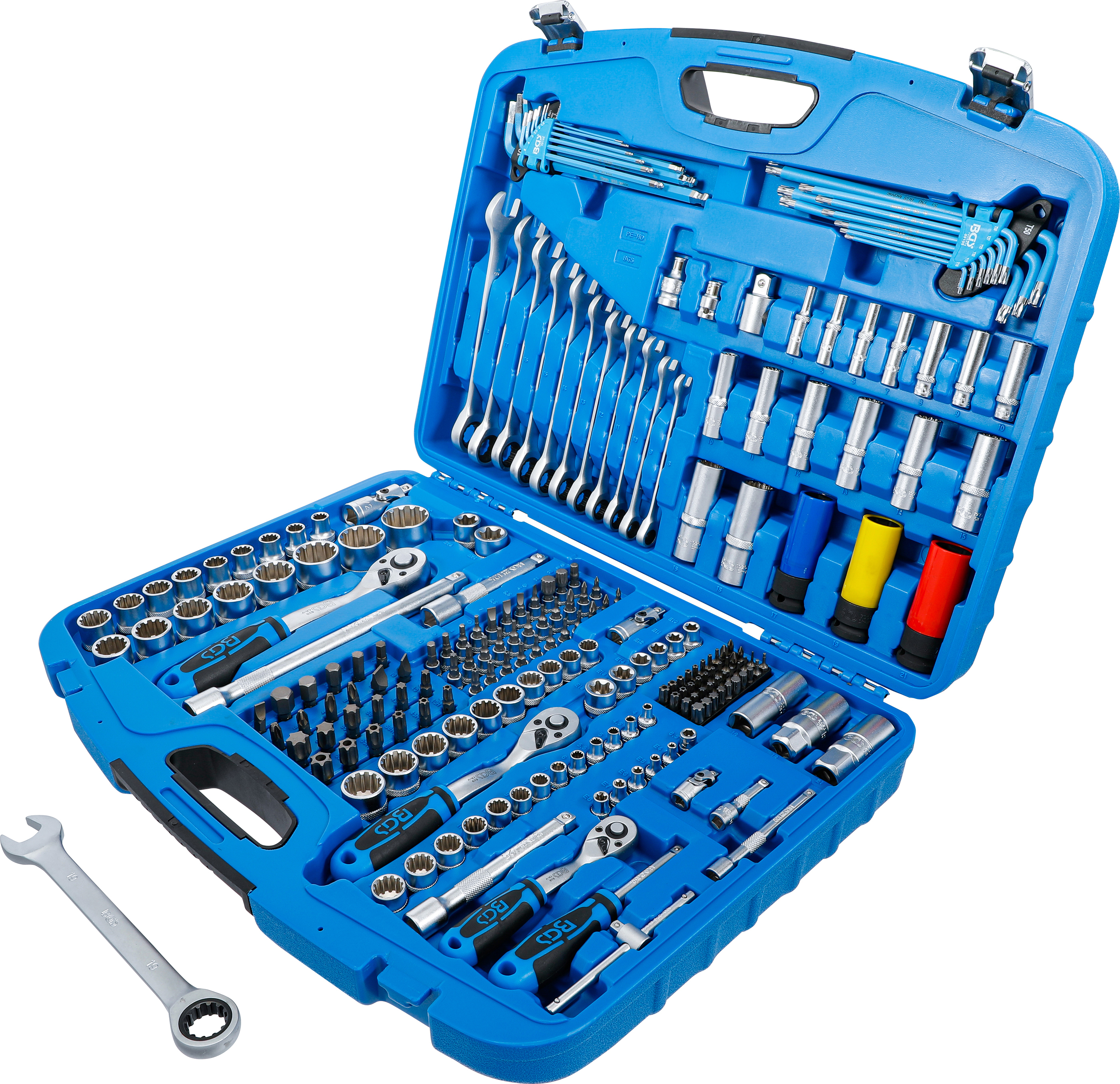 Der 218-teilige BGS Steckschlüssel-Satz in Gear-Lock-Ausführung überzeugt durch seine vielseitige Einsetzbarkeit und hohe Qualität. Gefertigt aus haltbarem Chrom-Vanadium-Stahl, ist er ideal geeignet für professionelle Werkstätten sowie anspruchsvolle Heimwerker. Die drei unterschiedlichen Antriebsgrößen 6,3 mm (1/4"), 10 mm (3/8") und 12,5 mm (1/2") decken nahezu alle gängigen Anwendungen von Feinmechanik bis Kfz-Technik ab. Durch die matt verchromte Oberfläche bietet das Set optimalen Korrosionsschutz und eine angenehme Haptik. Die umfangreiche Auswahl an Stecknüssen, Verlängerungen, Bits und Ratschen sorgt für präzises Arbeiten und maximalen Komfort.