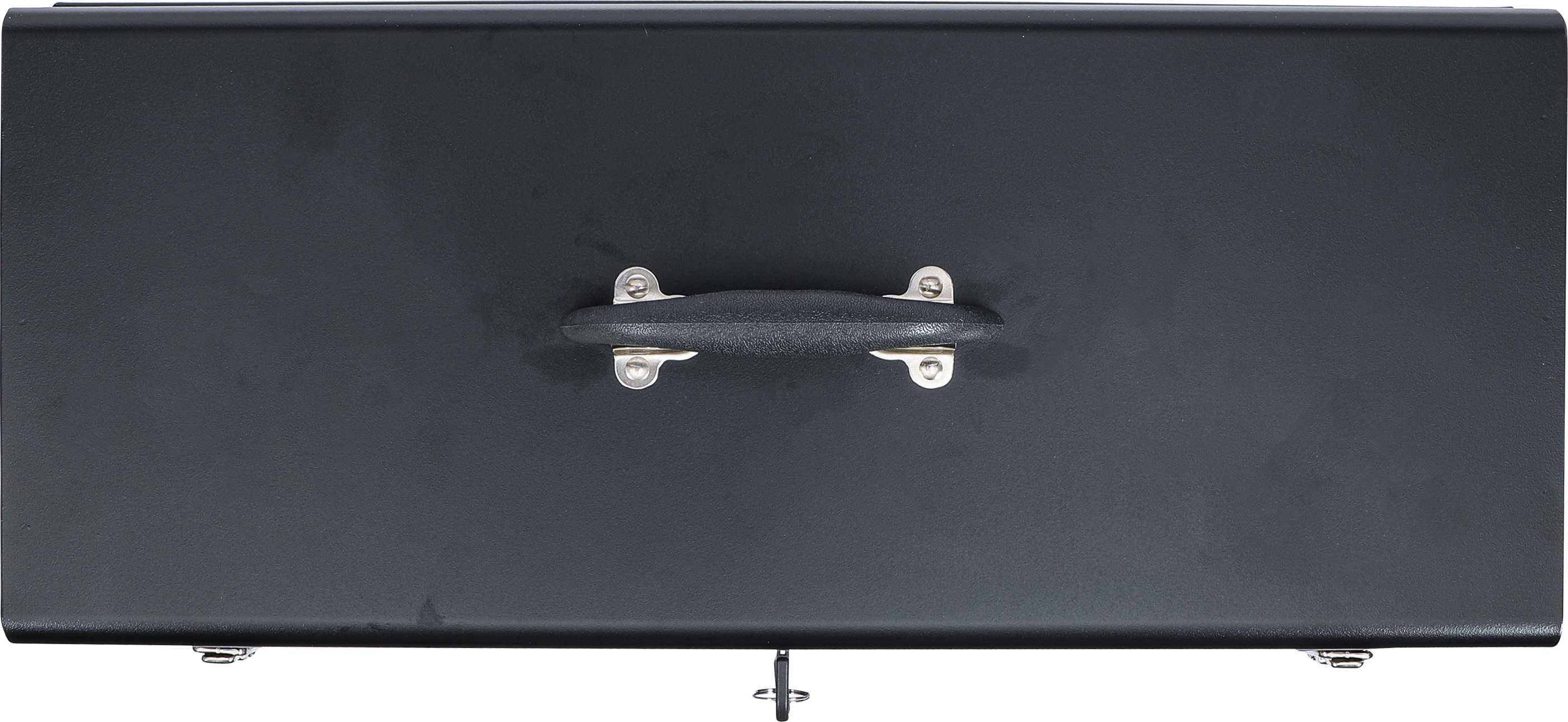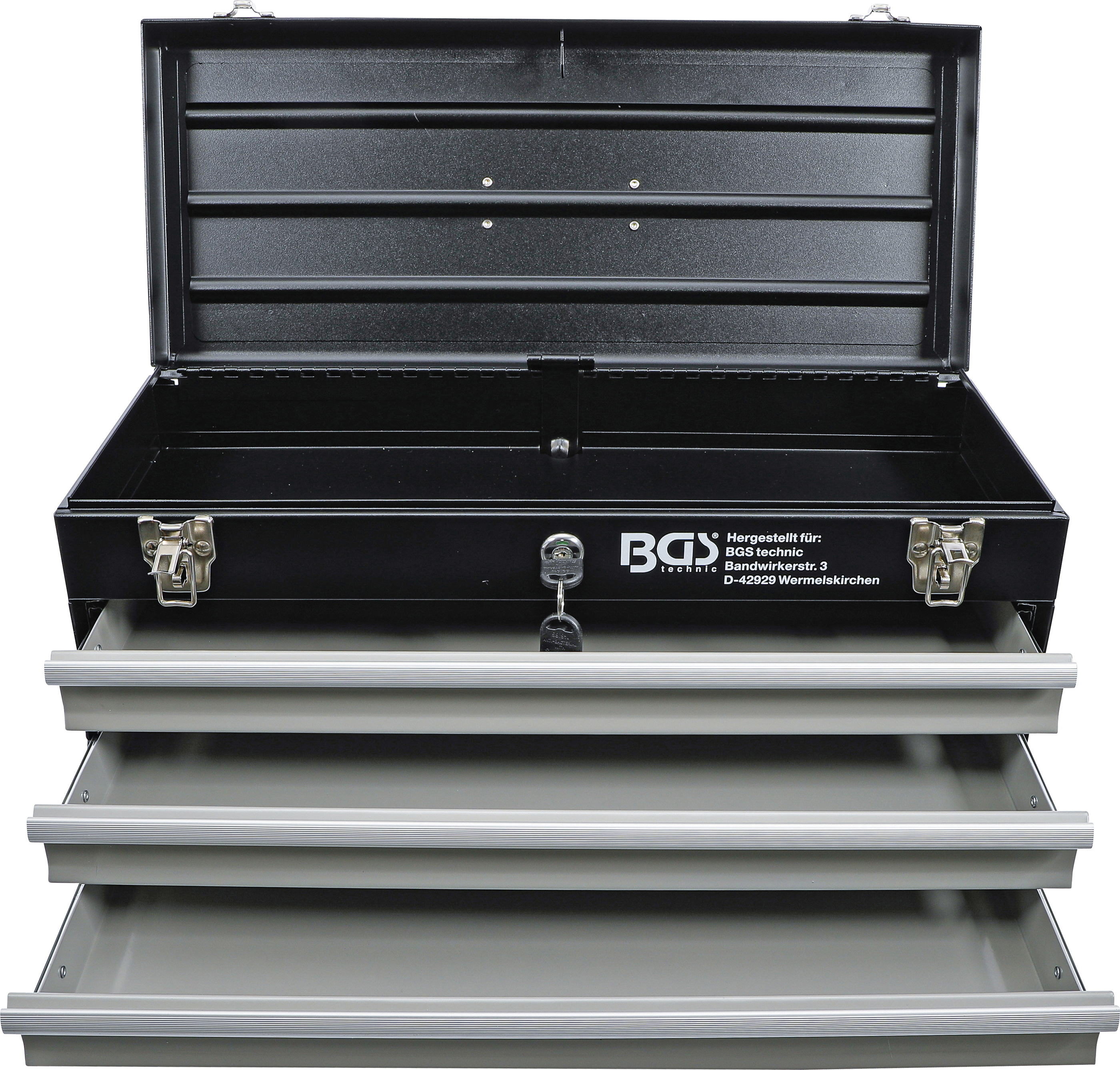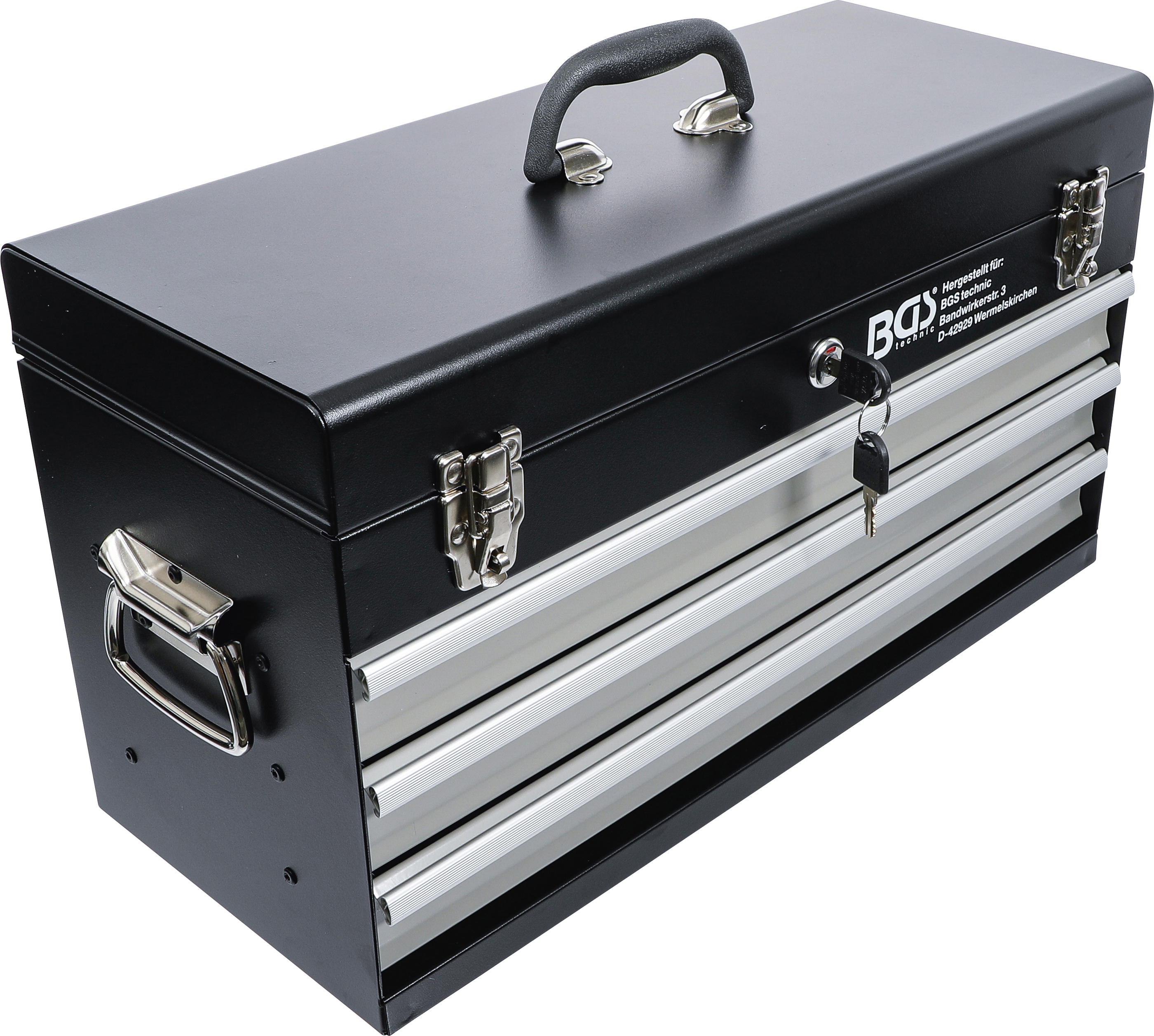 Dieser hochwertige Metall-Werkzeugkoffer in robuster Werkstattausführung überzeugt durch seine funktionale Ausstattung und hervorragende Belastbarkeit. Der Koffer bietet ein großzügiges Stauraumkonzept mit einem oberen Fach und drei Schubladen, die jeweils bis zu 6 kg Tragkraft aufweisen. Damit ermöglicht er eine sichere und strukturierte Aufbewahrung Ihrer Werkzeuge, egal ob in der Werkstatt oder unterwegs.