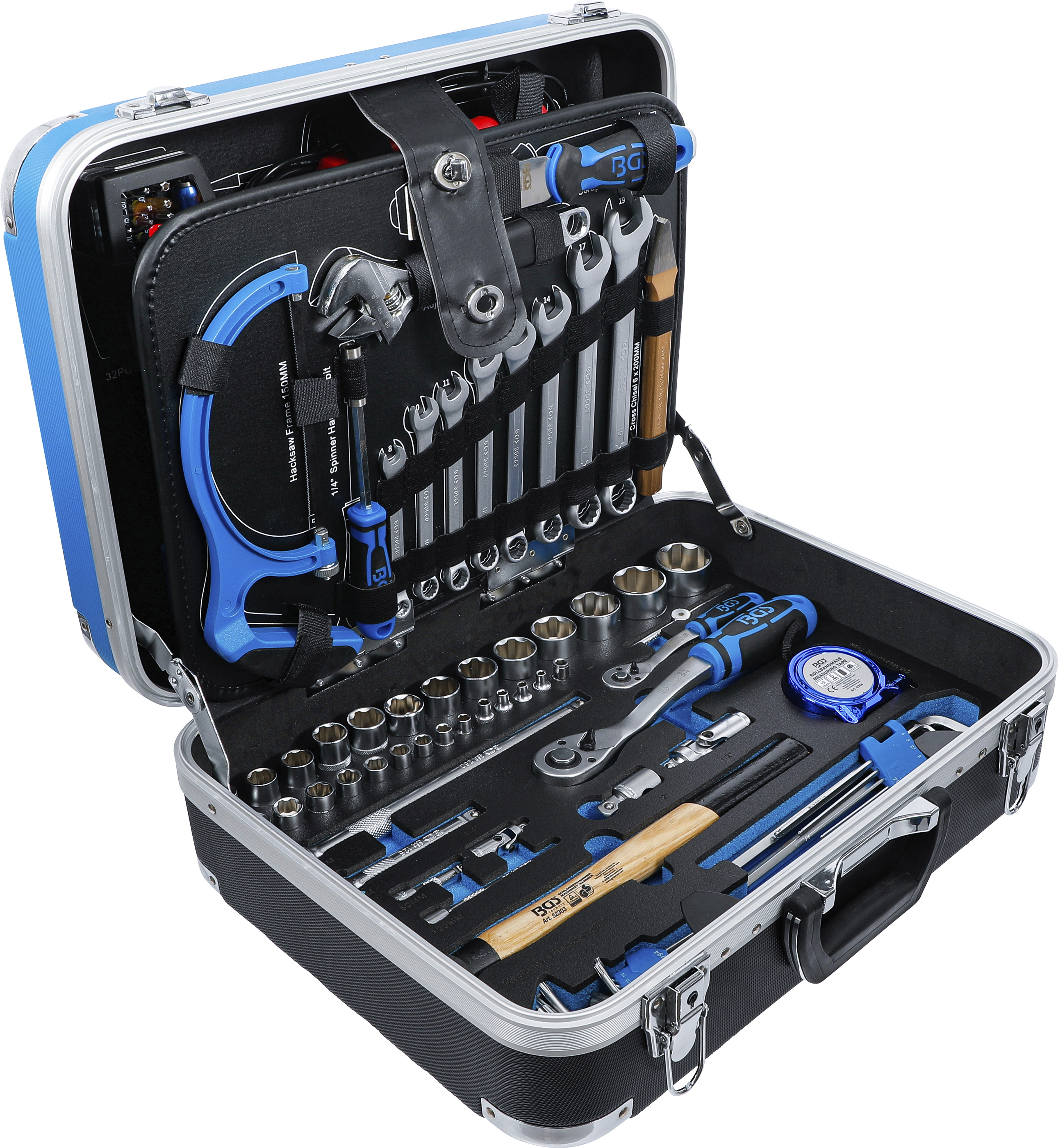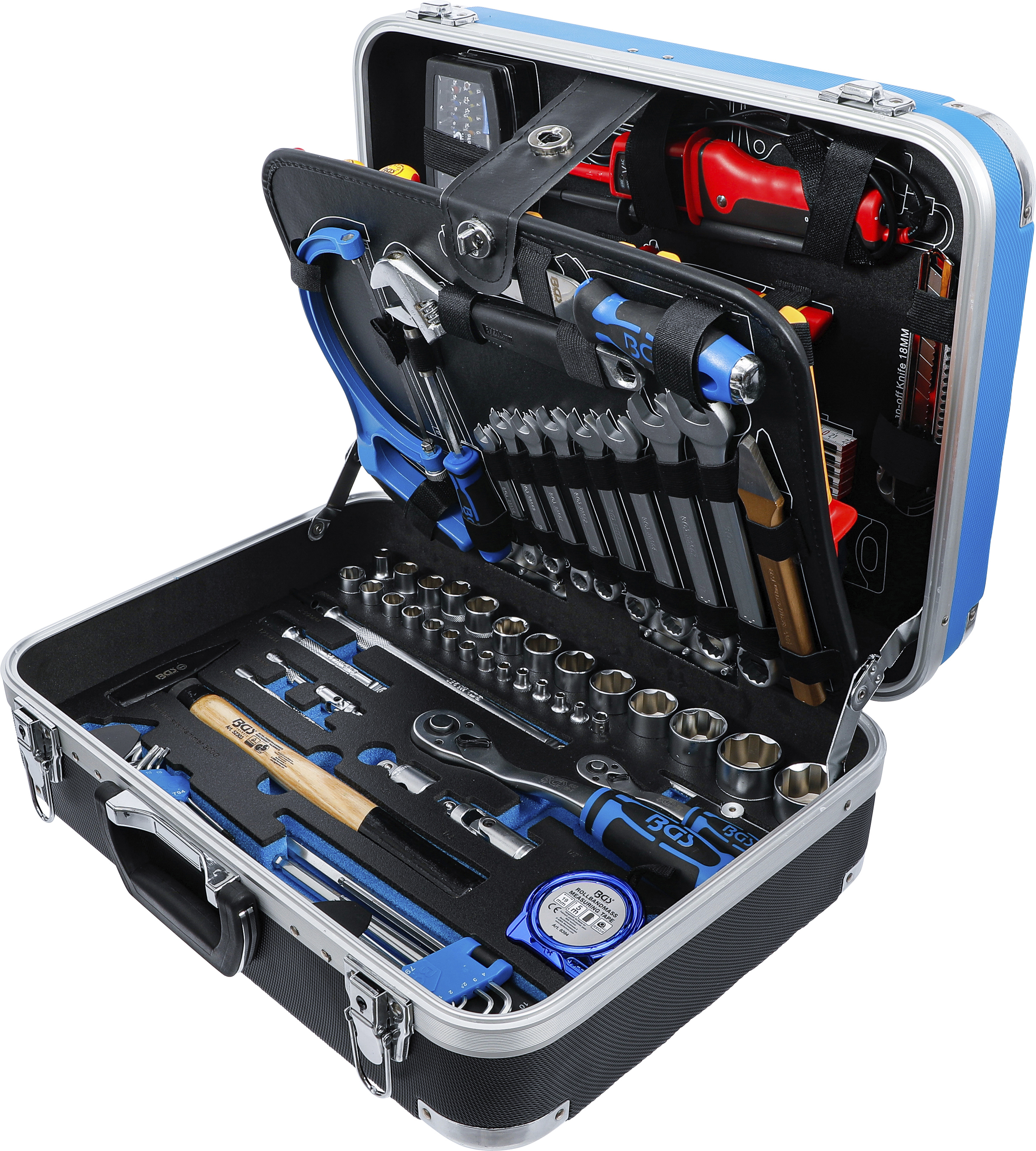 Die enthaltenen Steckschlüsseleinsätze, Umschaltknarren, VDE-Zangen, Schraubendreher und Maul-Ringschlüssel sind aus hochwertigem Chrom-Vanadium-Stahl gefertigt und bieten langlebige Qualität für den täglichen Einsatz.