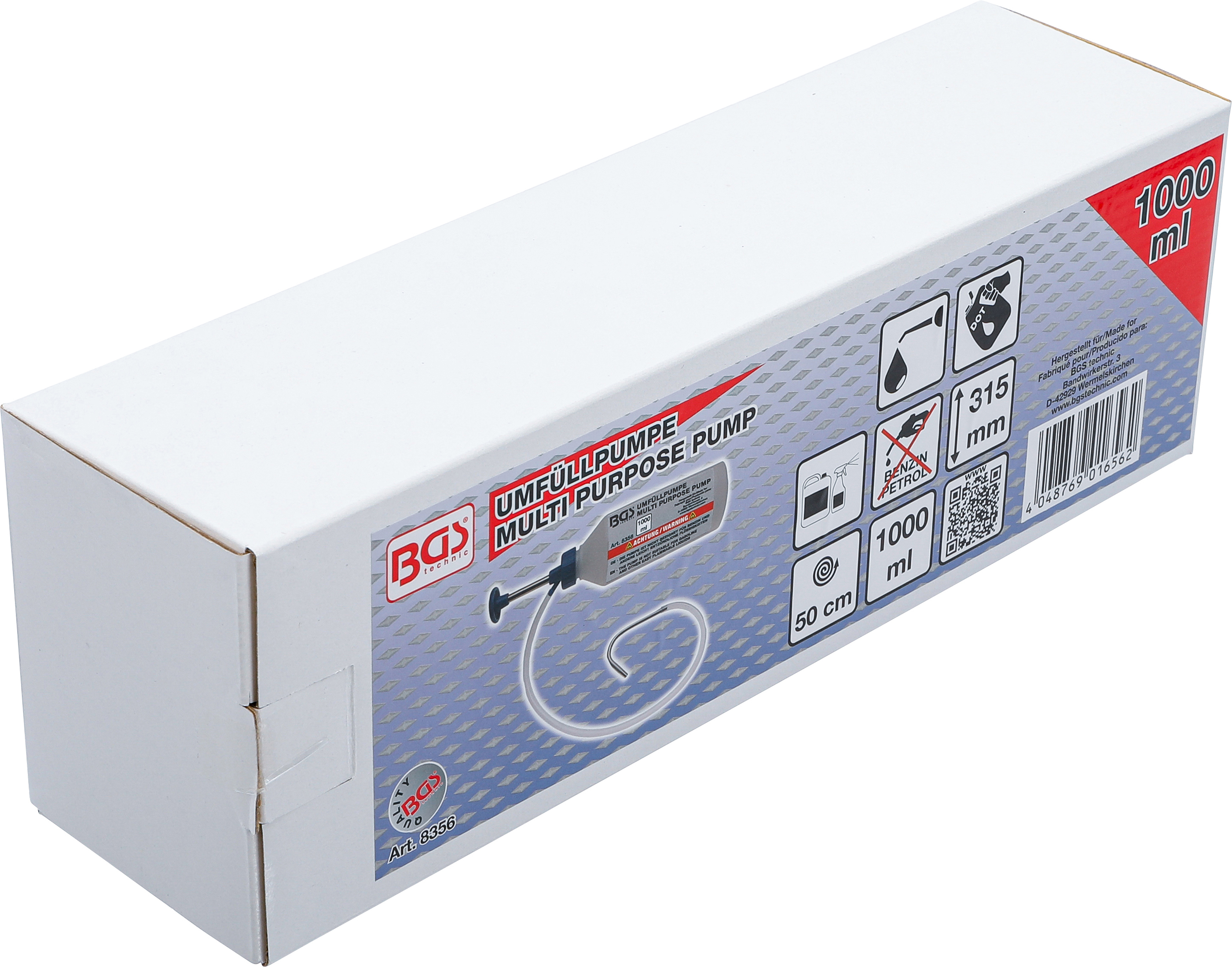 Die BGS Umfüllpumpe ist ein praktisches Werkzeug zum einfachen Befüllen und Nachfüllen von nicht brennbaren Flüssigkeiten. Sie eignet sich ideal für den Einsatz in Werkstatt und Garage – beispielsweise für den Umgang mit Öl, Bremsflüssigkeit oder Reinigungsmitteln. Dank der handlichen Konstruktion mit einer Gesamtgröße von 315 mm und einem Flascheninhalt von 1000 ml können Sie Flüssigkeiten präzise und sauber umfüllen. Bitte beachten Sie, dass die Pumpe nicht zum Absaugen geeignet ist und nicht mit Benzin oder anderen leicht entzündlichen Flüssigkeiten verwendet werden darf. Das Bruttogewicht beträgt 398 g.