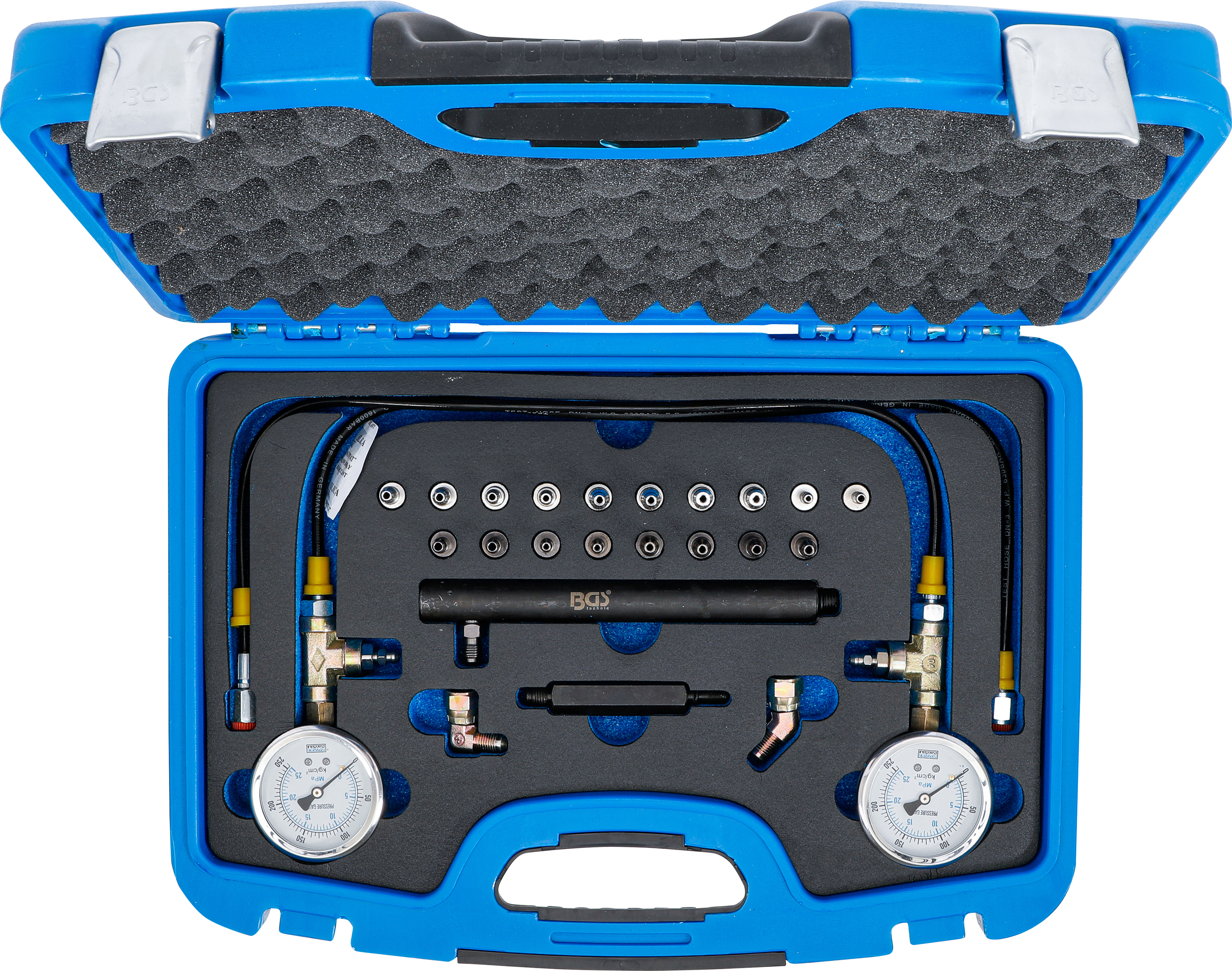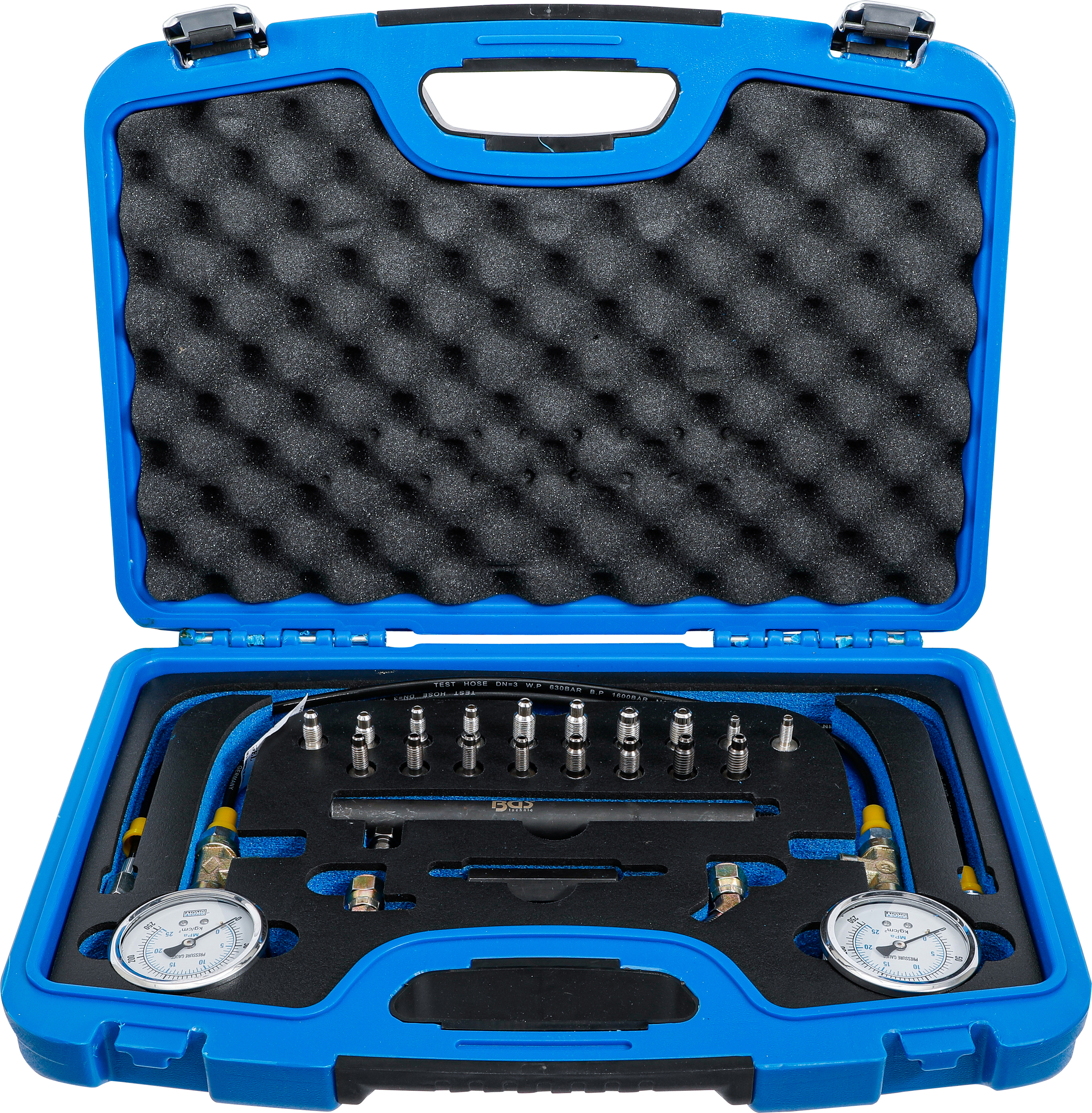 Der Bremsdruck-Prüfmanometer-Satz ermöglicht eine präzise Überprüfung des hydraulischen Bremsdrucks direkt an Radbremszylinder, Bremssattel, Hauptbremszylinder oder der Hydraulikpumpeneinheit bei Teves ABS-Systemen mit Druckspeicher. Das Werkzeug ist ideal geeignet, um eine exakte Druckdifferenzmessung zwischen den beiden Bremskreisen durchzuführen. Die hochwertigen Komponenten gewährleisten einen sicheren und zuverlässigen Einsatz in Werkstatt und professioneller Fahrzeugdiagnose. Durch die umfangreiche Auswahl an Adaptern und Fittingen ist eine flexible Anwendung an verschiedenen Bremssystemen möglich.