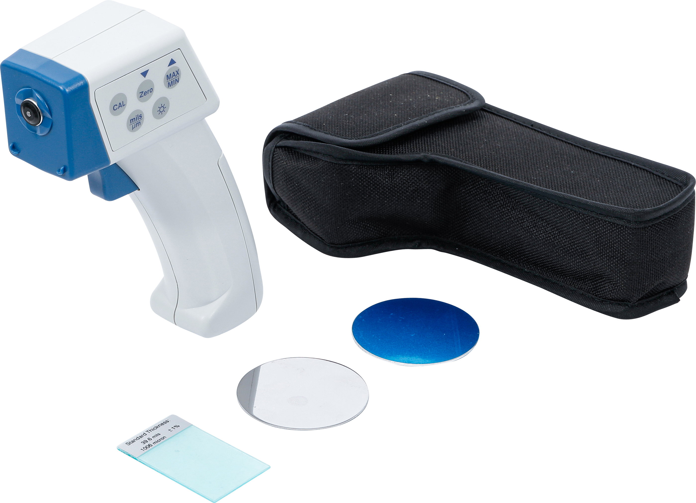 Das BGS Lackschichten-Messgerät ist ein professionelles Prüfgerät zur präzisen Messung der Lackschichtdicke auf Oberflächen aus Eisen- und Nichteisen-Metallen, darunter Aluminium, Stahl, Kupfer oder Messing. Dank der beleuchteten Digitalanzeige und intuitiven Einhandbedienung lässt sich das Gerät komfortabel einsetzen – ideal für Werkstatt, Lackierbetrieb oder Fahrzeugbewertung. Der Messrahmen von 0 – 40 mils bzw. 0 – 1000 µm bietet eine große Bandbreite an Anwendungsmöglichkeiten. Mit einer Auflösung von 0,1 mils / 0,1 µm und einer Genauigkeit von +/- 4 dgts (0 – 7,8 mils) bzw. +/- 10 dgts (0 – 199 µm) liefert das Messgerät verlässliche Ergebnisse. Eine Reaktionszeit von nur einer Sekunde, die Auto-Hold-Funktion sowie die automatische Abschaltfunktion sorgen zudem für eine effiziente Nutzung im Alltag.