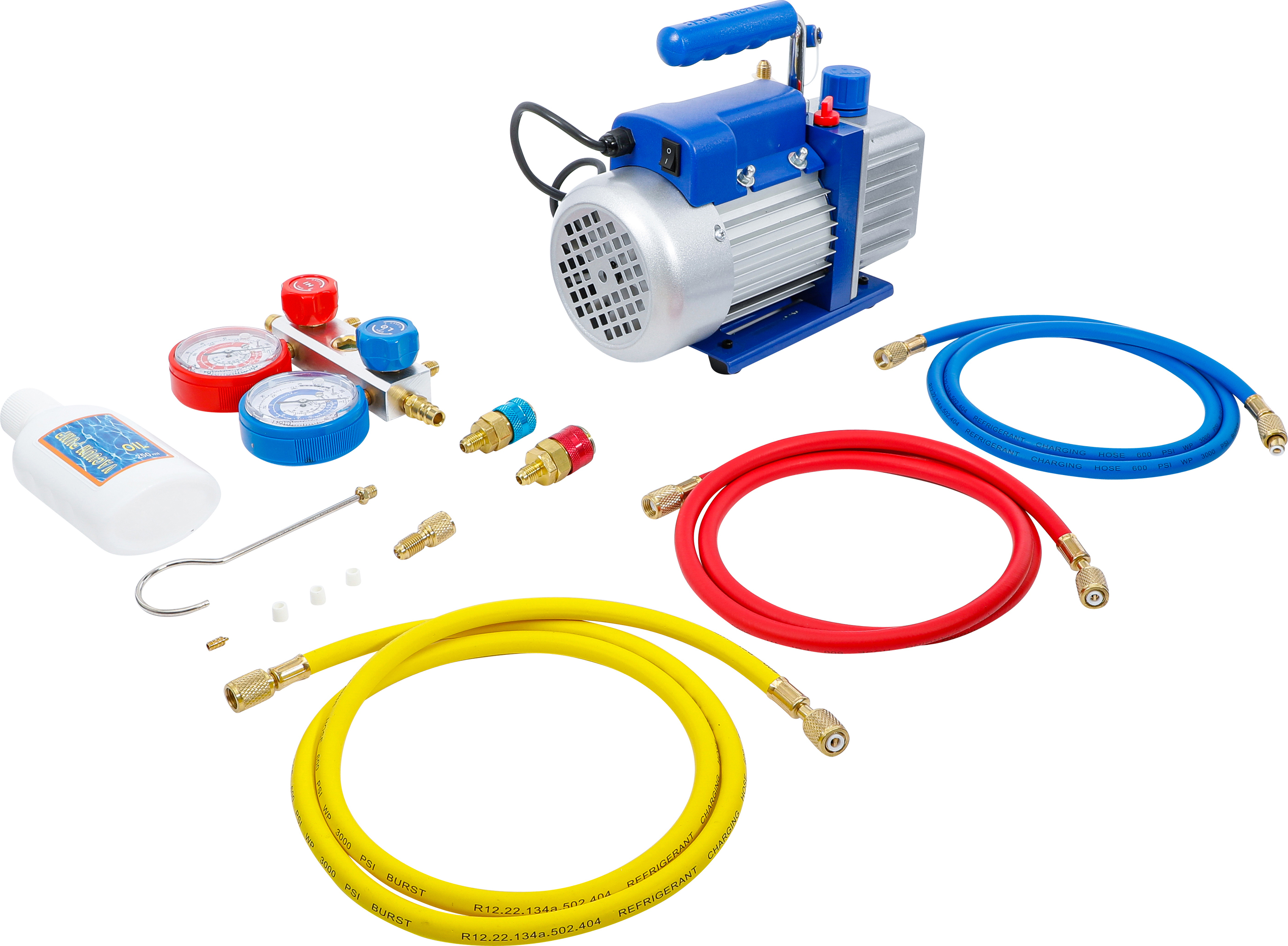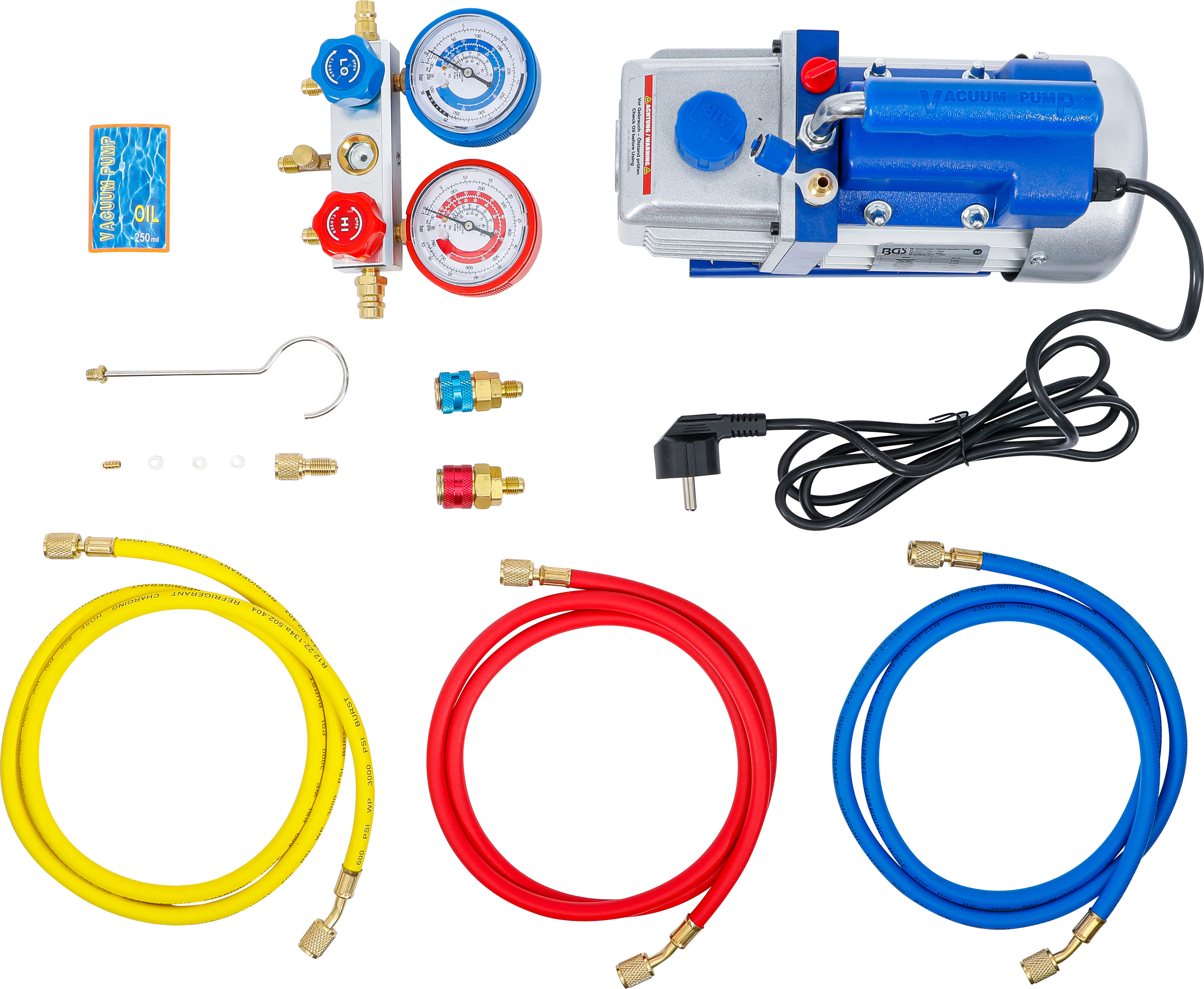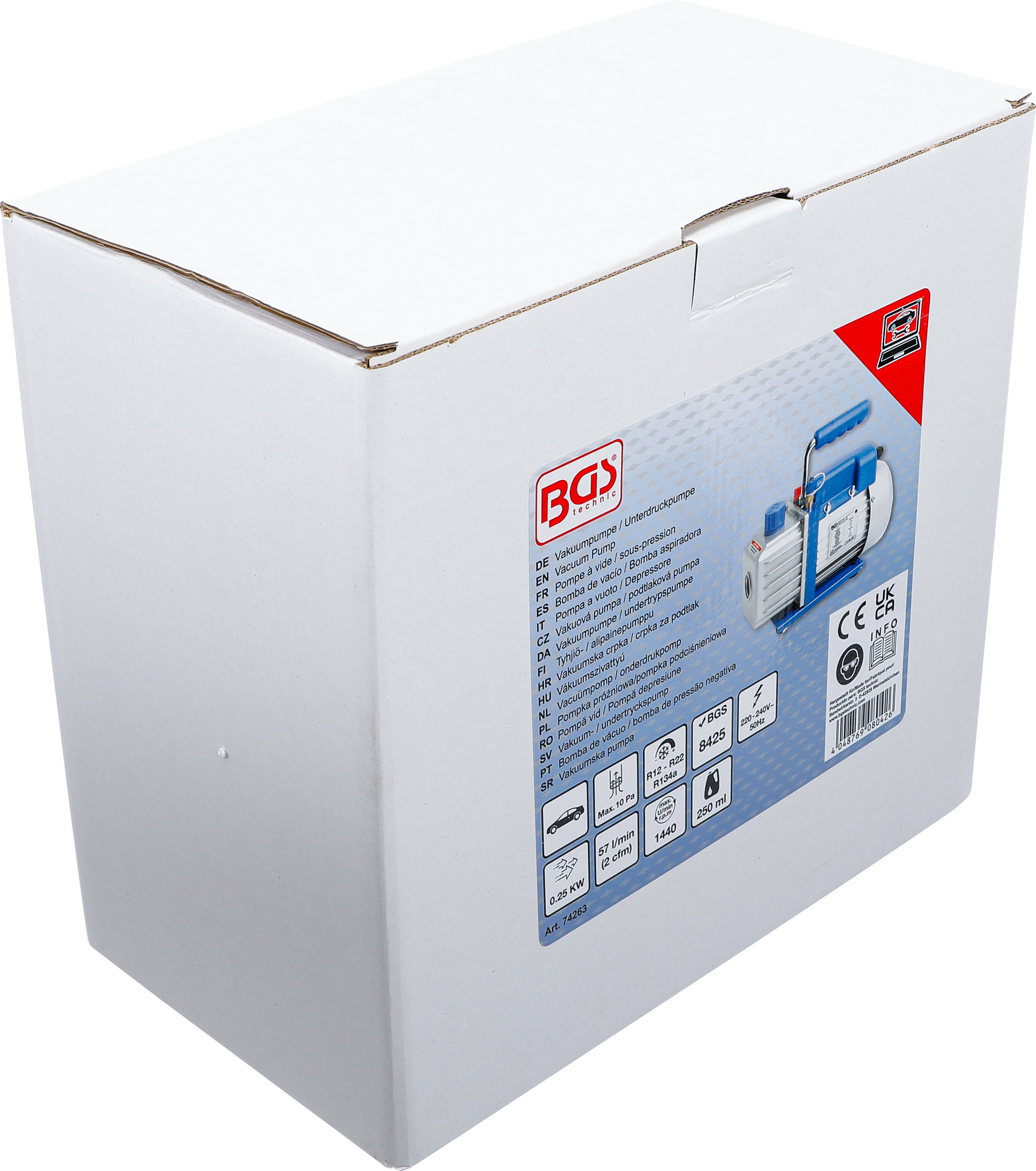 Die 1-stufige BGS Vakuumpumpe / Unterdruckpumpe ist ein zuverlässiges Werkzeug für die professionelle Reparatur und Wartung von Klimaanlagen (R12, R22, R134a) sowie für Vakuumverpackungen. Mit einer Durchflussrate von 57 l/min (2 cfm) und einem ultimativen Unterdruck von 10 Pa ermöglicht sie präzises und schnelles Arbeiten. Das robuste Aluminiumgehäuse sorgt für Haltbarkeit und Stabilität im täglichen Werkstatteinsatz. Dank der Motorleistung von 0,25 kW, einer maximalen Drehzahl von 1440 U/min und der kompakten Bauform ist diese Vakuumpumpe besonders effizient und benutzerfreundlich. Die Ölkapazität beträgt 250 ml, wodurch eine zuverlässige Schmierung der Mechanik gewährleistet wird.