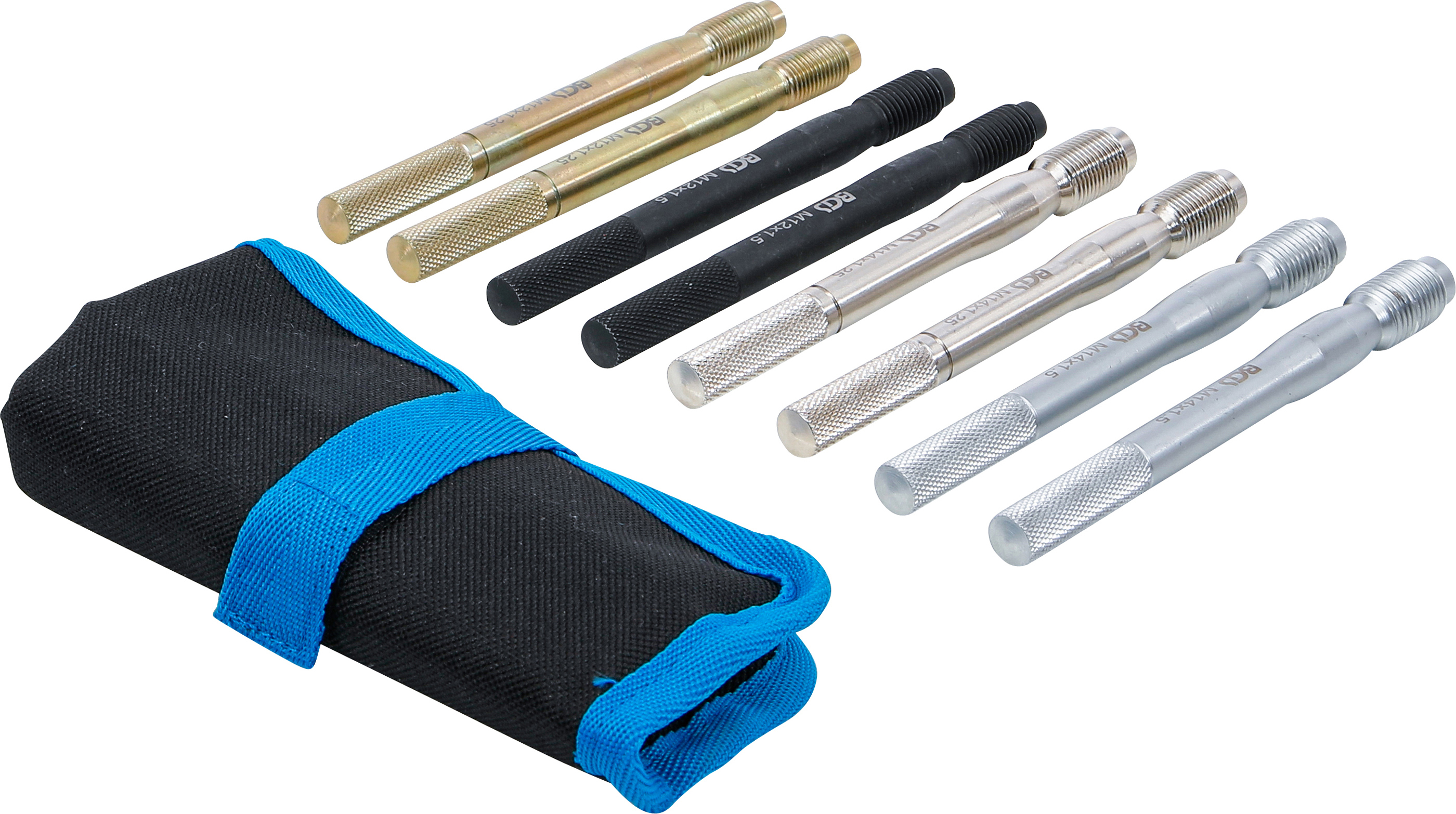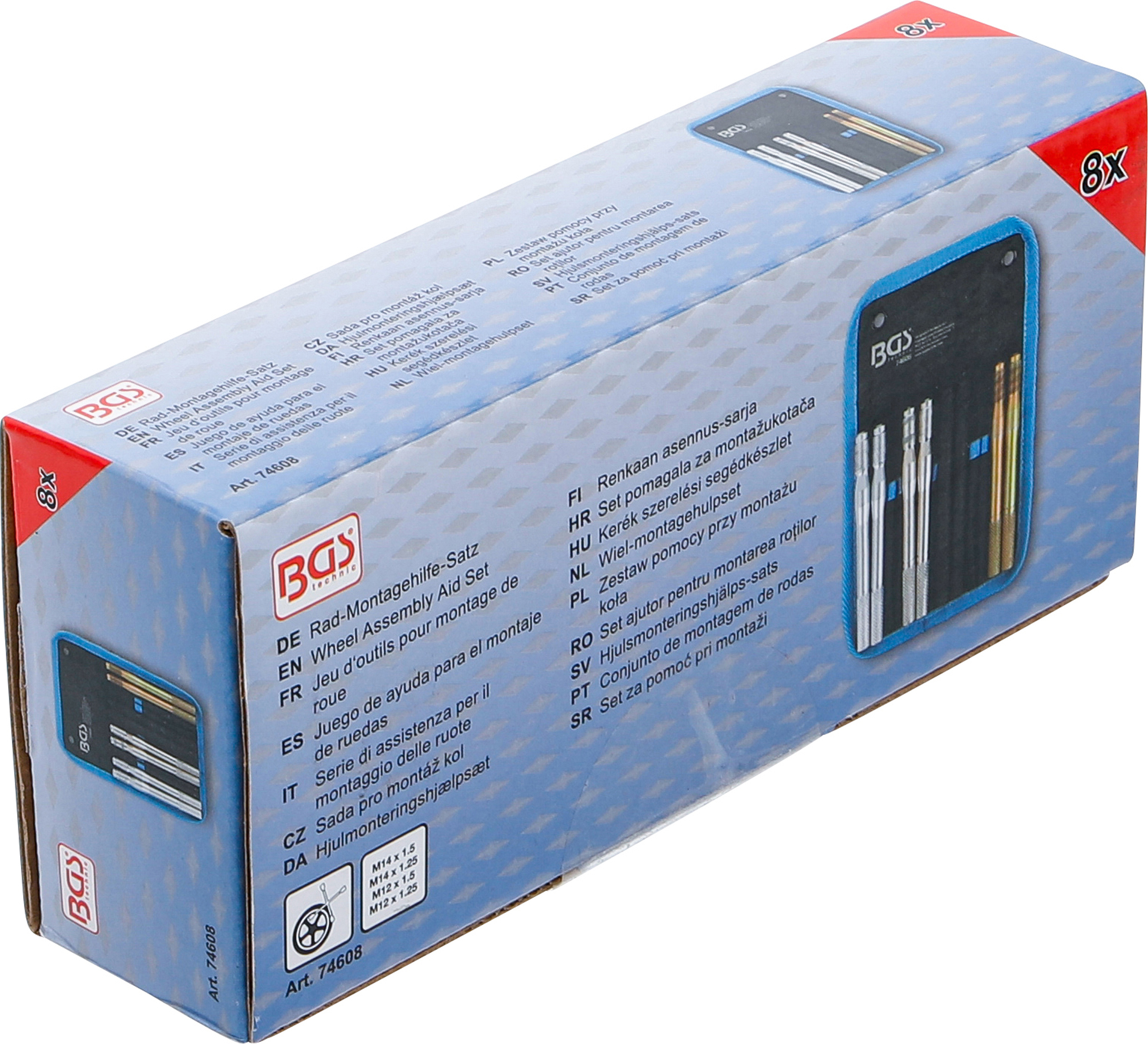 Der 8-teilige Rad-Montagehilfe-Satz ist das ideale Werkzeug, wenn Sie Ihre Räder schnell, sicher und ohne Beschädigung montieren möchten. Er ermöglicht das einfache Fixieren des Rades an der Radnabe und bietet eine perfekte Unterstützung, insbesondere wenn Spurplatten montiert werden sollen. Durch die Rändelung haben Sie stets sicheren Halt beim Einschrauben. Hergestellt aus robustem Werkzeugstahl, überzeugt der Satz durch Langlebigkeit und Stabilität. Mit einer Länge von 133 mm und einem Bruttogewicht von 910 g liegt das Werkzeug optimal in der Hand. Dank vier verschiedener Gewindegrößen lässt sich der Satz universell einsetzen – passend für die meisten Fahrzeughersteller und -modelle.
