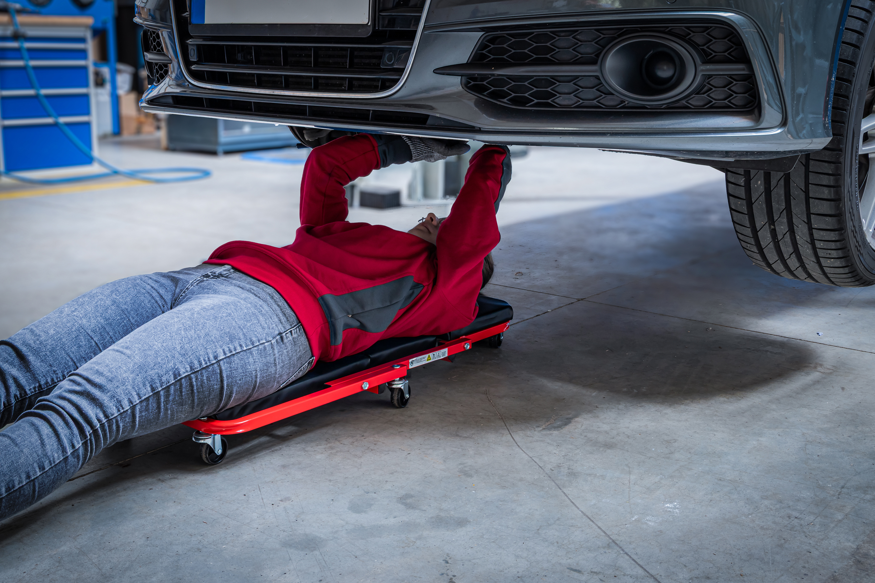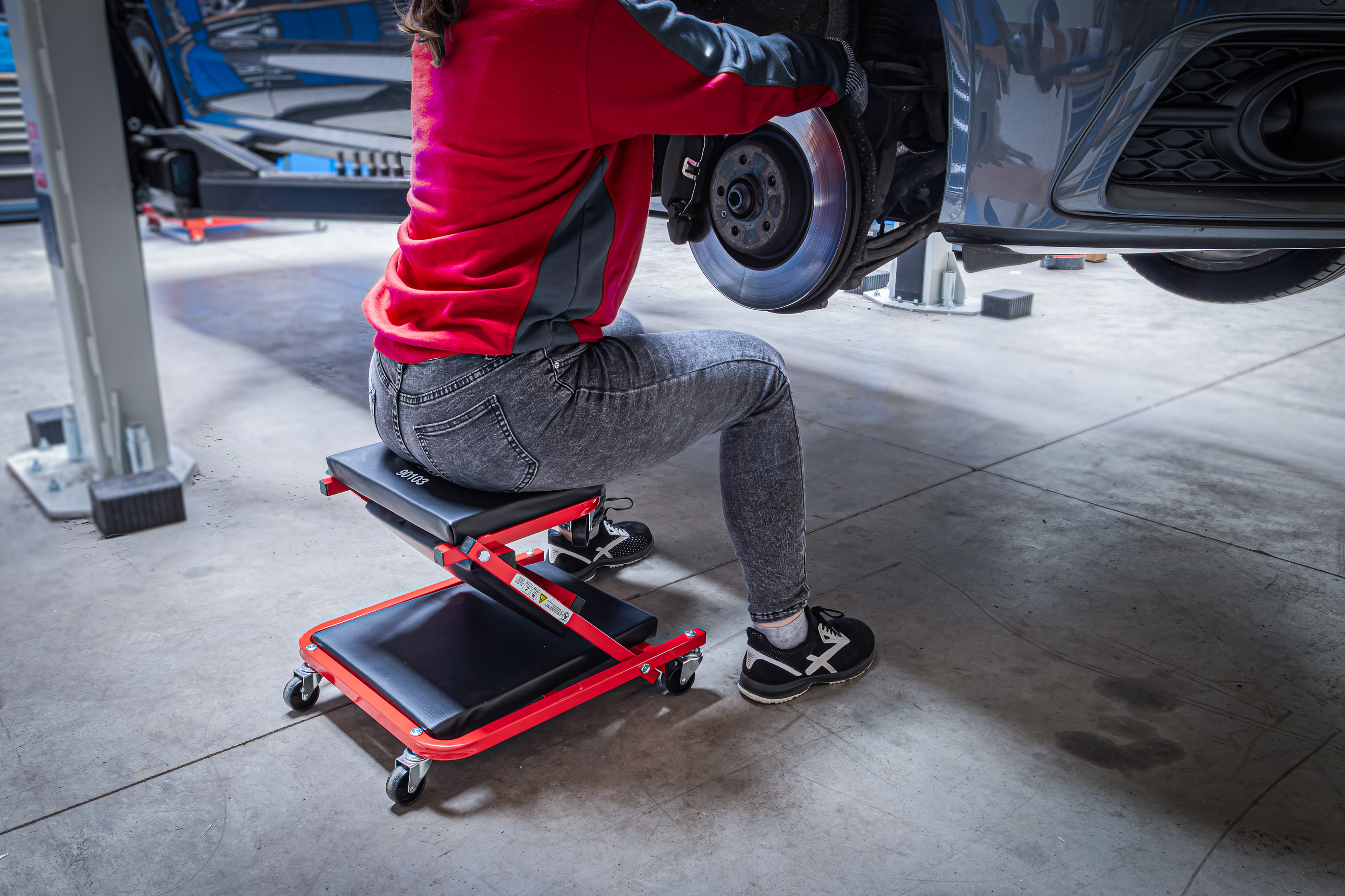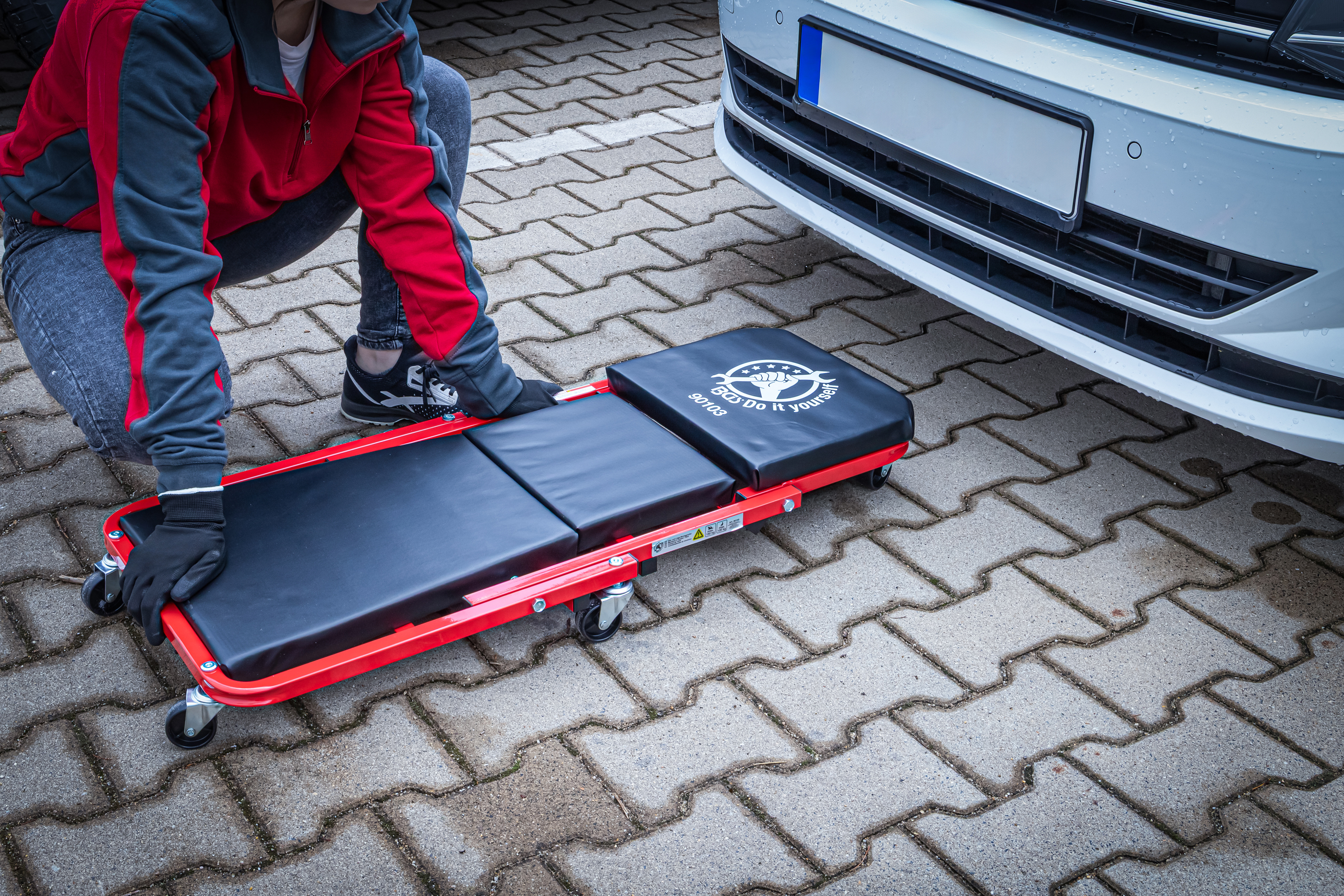 Der vielseitige Sitz- und Liege-Montageroller ist die ideale Lösung für komfortables Arbeiten an und unter dem Fahrzeug. Dank seiner extra geringen Bauhöhe ermöglicht er eine ergonomische Arbeitsposition, auch bei beengten Platzverhältnissen. Mit wenigen Handgriffen lässt sich der Roller vom Sitz zum Rollbrett umfunktionieren – perfekt für Werkstatt, Garage oder Hobbybereich.