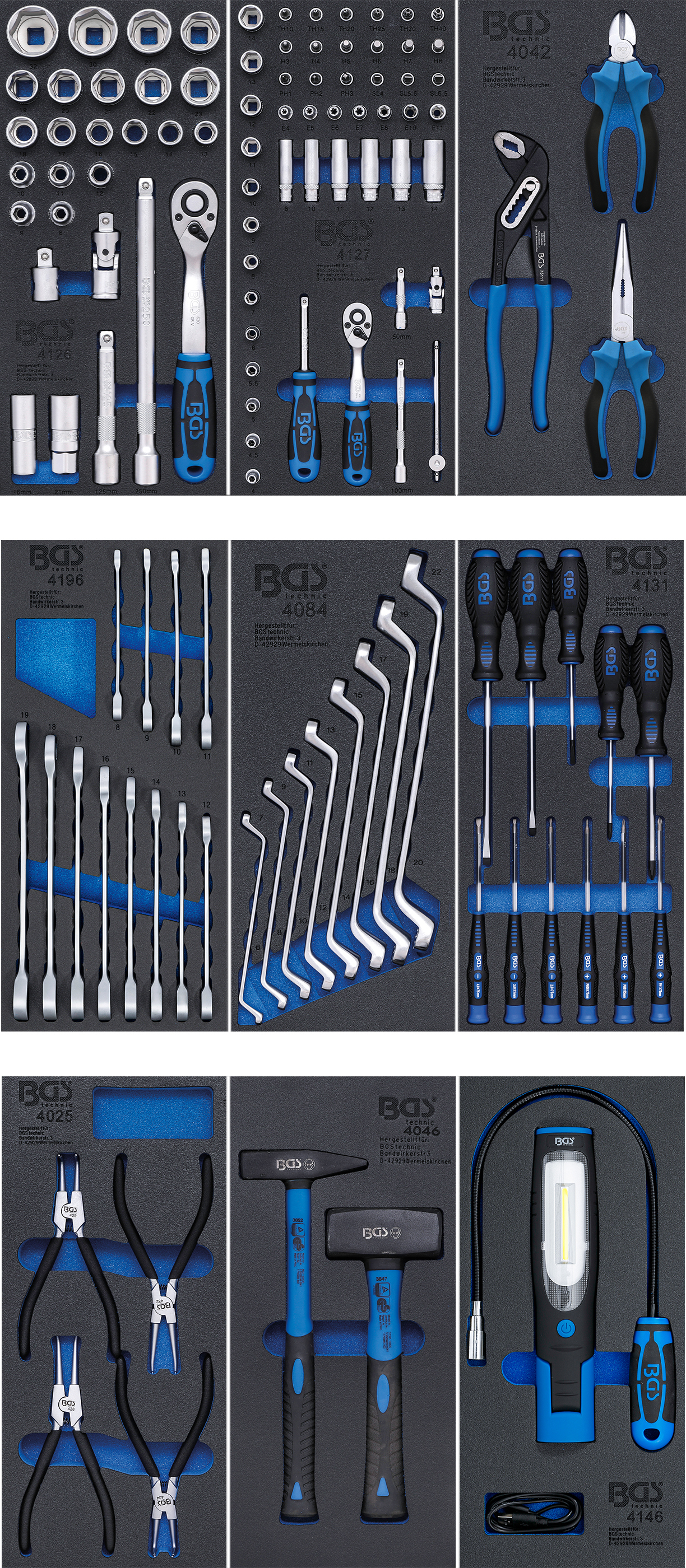 Durch die neun 1/3-Werkstatteinlagen aus robustem Hartschaum ist jedes Werkzeug sicher und geordnet untergebracht. Die Einlagen umfassen alles, was Sie für präzises Arbeiten benötigen – von Ratschen- und Schraubendrehersätzen bis hin zu Hämmern, Zangen und Handlampen. So haben Sie Ihr Werkzeug jederzeit griffbereit und optimal sortiert.