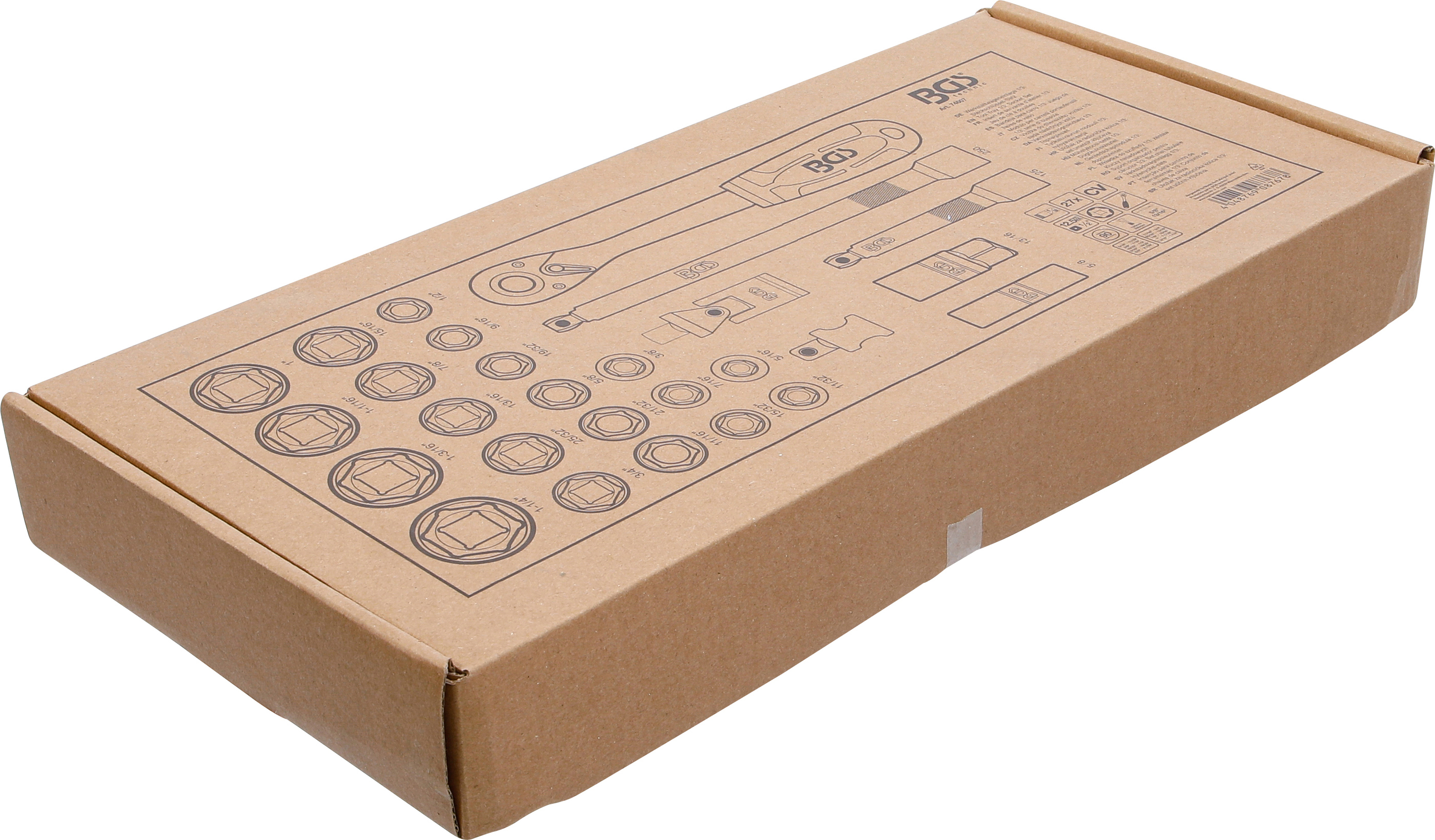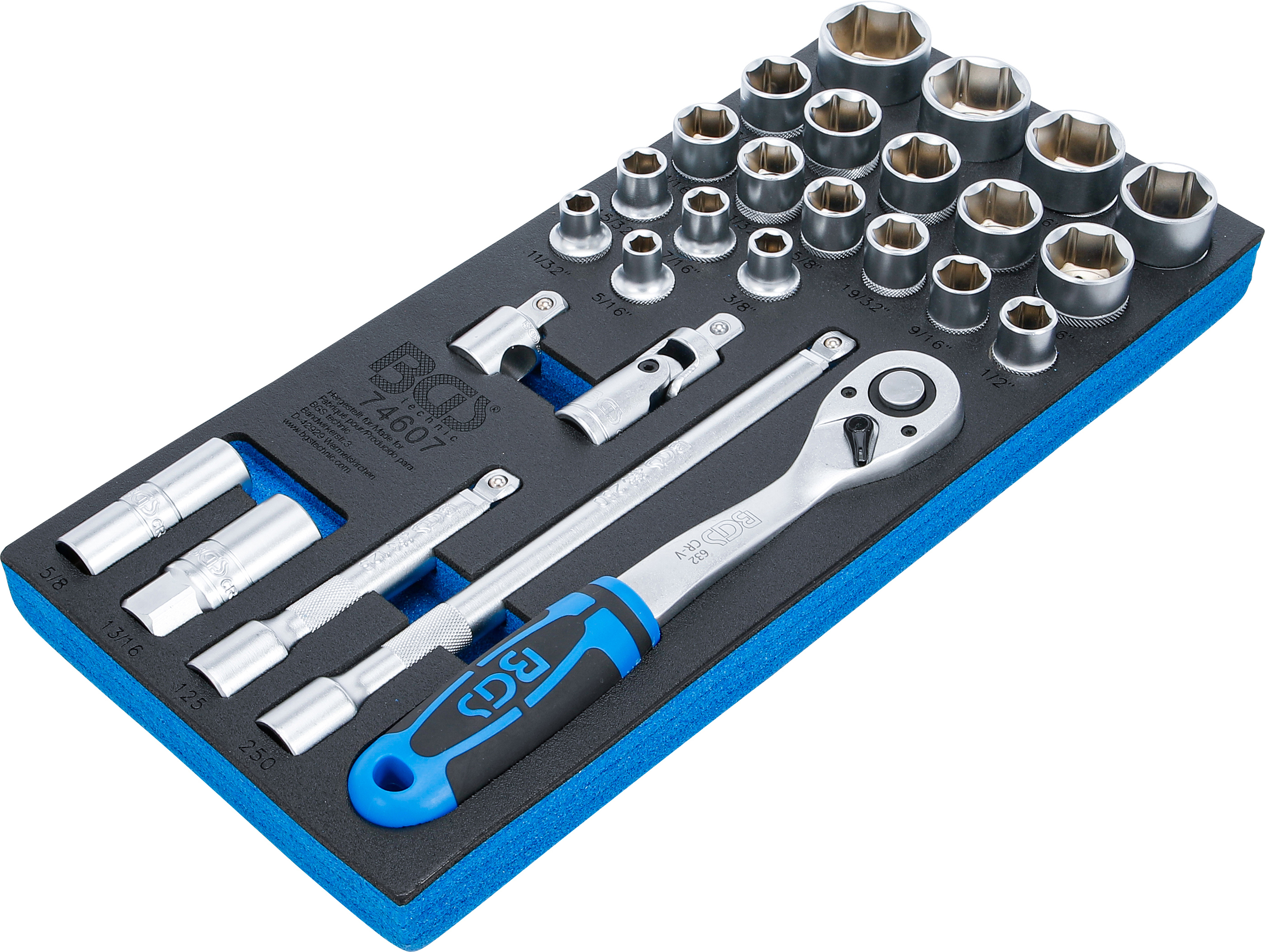 Gefertigt aus langlebigem Chrom-Vanadium-Stahl, bieten Steckschlüssel, Verlängerungen, Umschaltknarre und Gelenke eine besonders hohe Stabilität und Haltbarkeit. Die Einlage aus robustem Hartschaum sorgt für perfekte Ordnung im Werkstattwagen und schützt die Werkzeuge zuverlässig vor Beschädigungen. Jedes Teil hat seinen festen Platz – so behalten Sie Ihr Werkzeug stets griffbereit im Überblick. Passend für alle BGS Werkstattwagen und Schrankwand-Systeme.