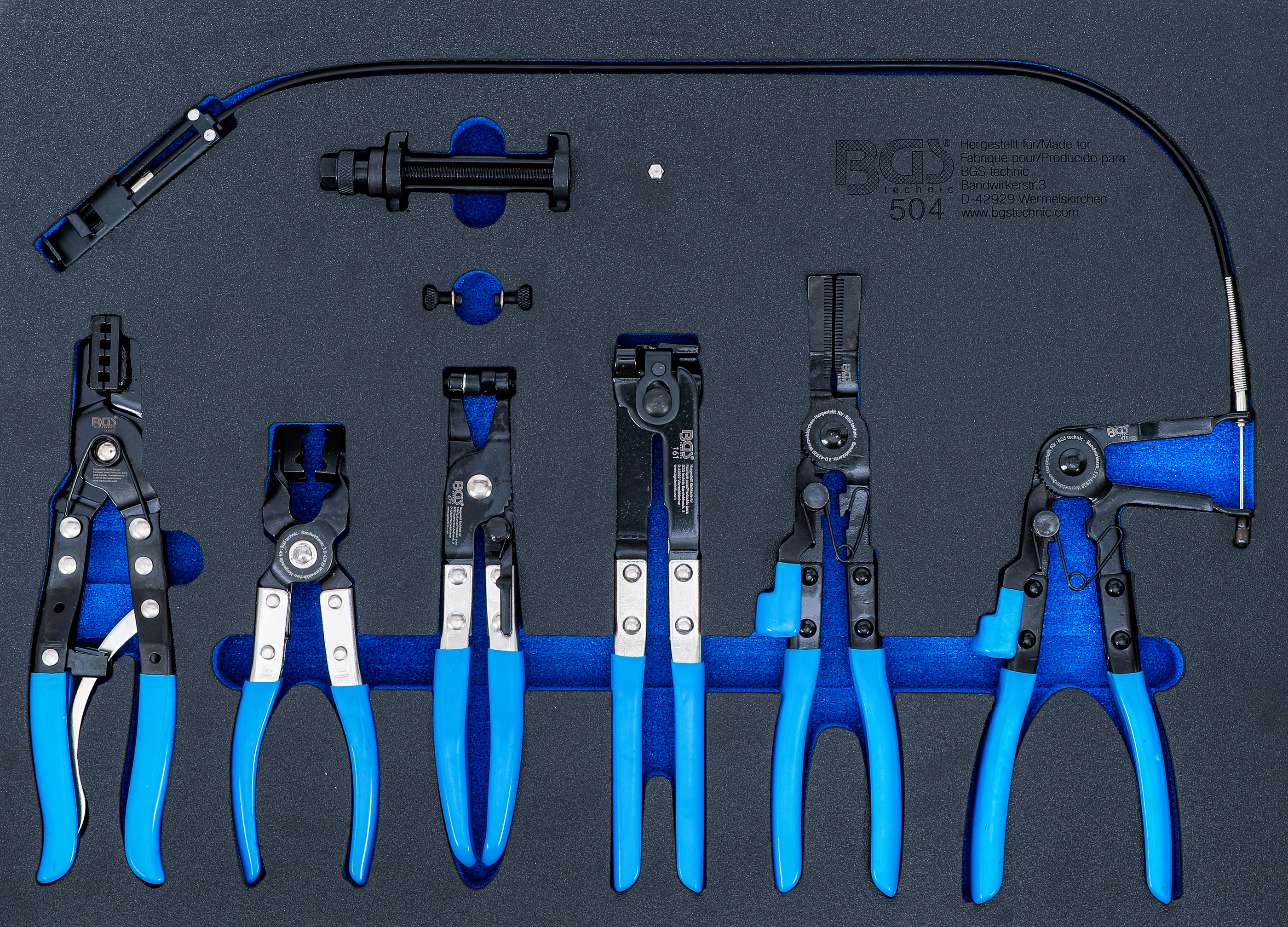 - Enthält alle gängigen Zangentypen für Schlauch- und Federbandschellen