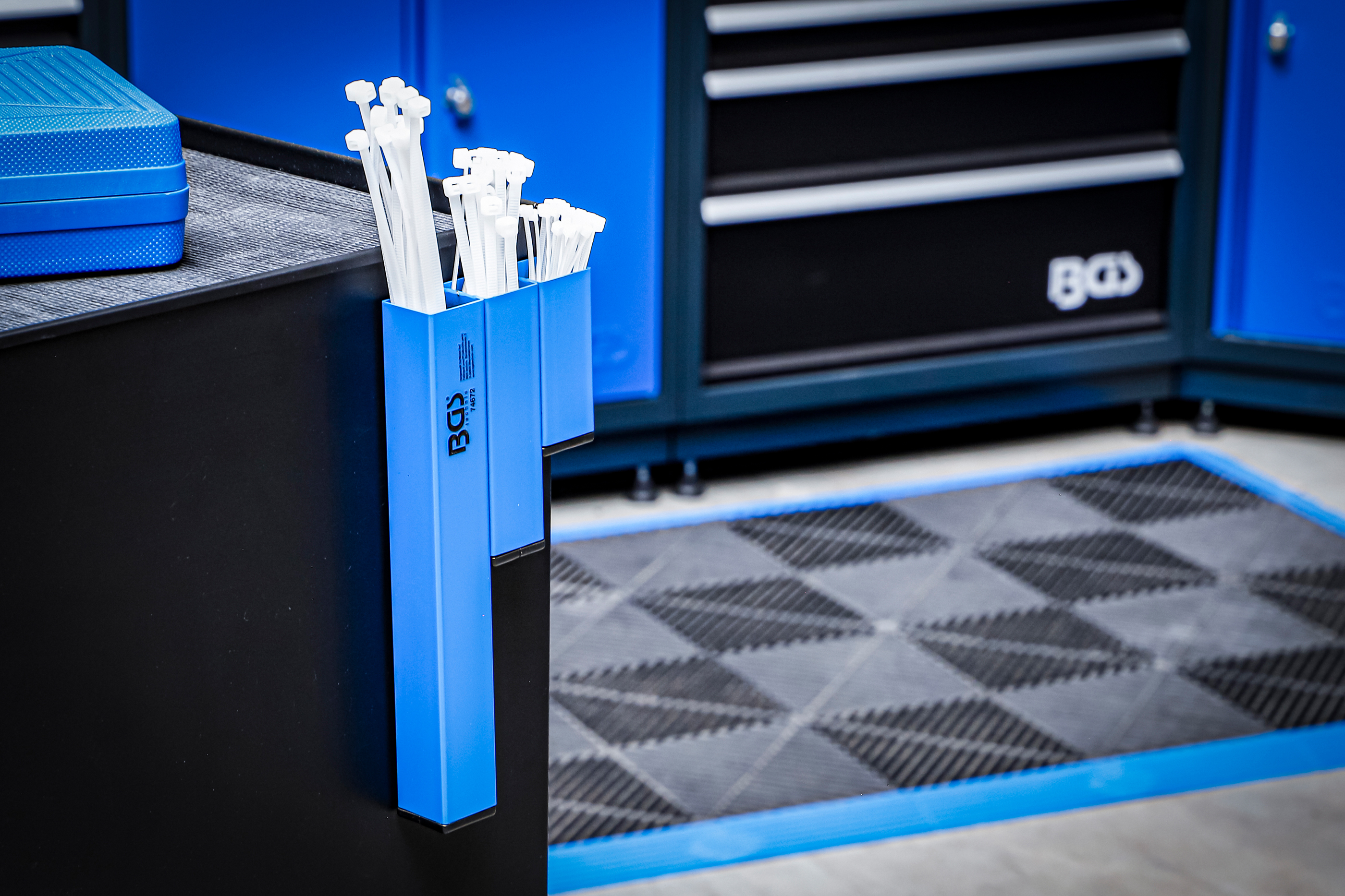Der Magnet-Kabelbinder-Halter ist die ideale Lösung, wenn Sie Ordnung in Ihre Werkstatt oder Ihren Lagerbereich bringen möchten. Durch die 3 Fächer können Sie Kabelbinder unterschiedlicher Längen übersichtlich sortieren – ideal für bis zu 200 Kabelbinder in den Größen 100 mm, 150 mm und 300 mm. Dank der magnetischen Befestigung mit gepolsterter Rückseite haftet der Halter sicher an metallischen Oberflächen, ohne Kratzer zu hinterlassen. So eignet sich dieses Zubehör perfekt für den Einsatz an Werkstattwagen, Schrankwand-Systemen oder Werkbänken. Die pulverbeschichtete Oberfläche sorgt dabei für eine langlebige und schmutzunempfindliche Nutzung.