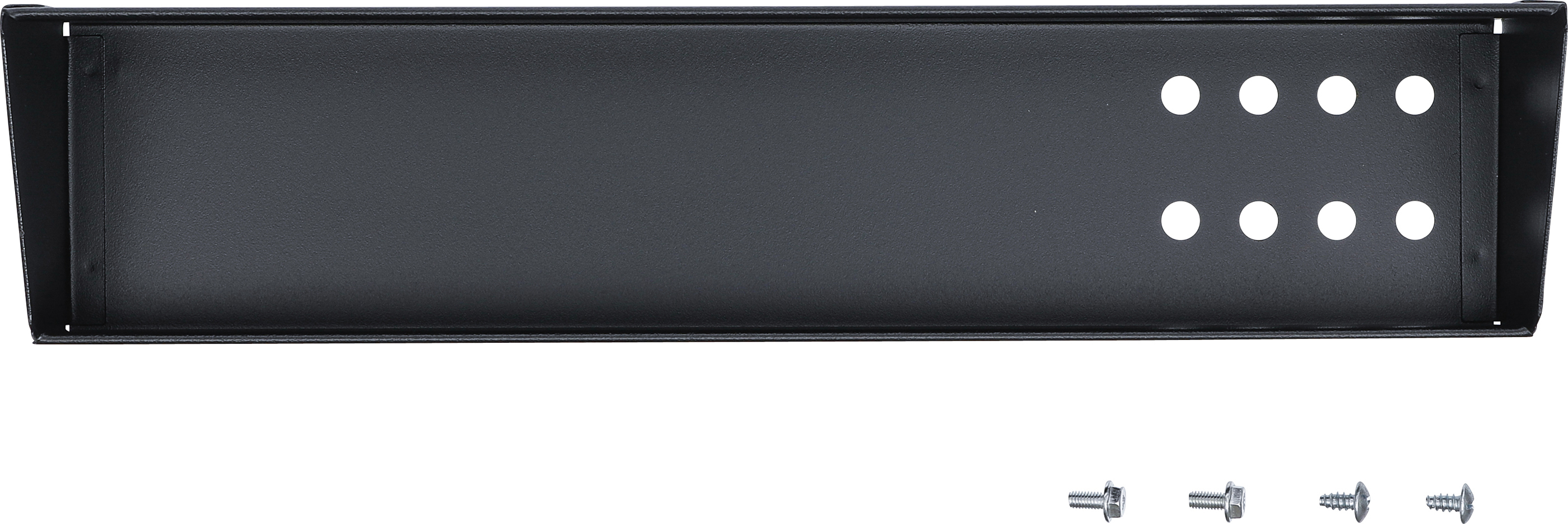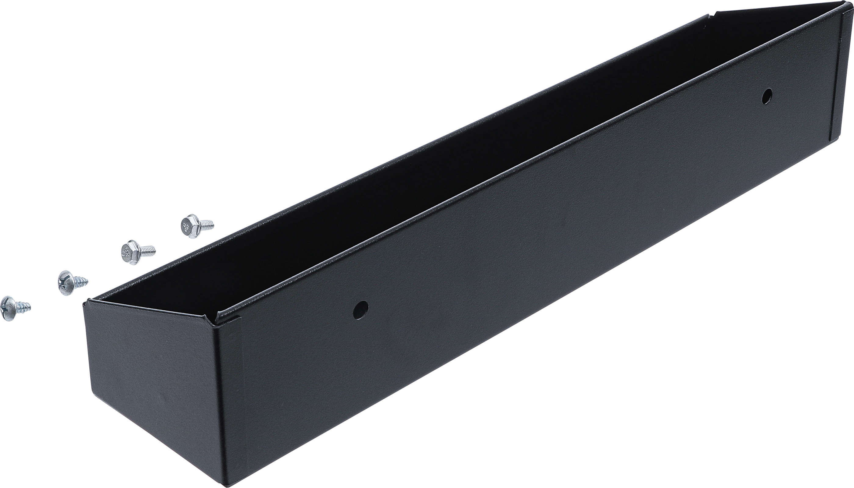 Durch die vorgebohrten Befestigungslöcher lässt sich das Ablagefach direkt am Werkstattwagen montieren – stabil, passgenau und ohne zusätzlichen Aufwand. Die robuste, pulverbeschichtete Oberfläche schützt zuverlässig vor Verschleiß und Korrosion. Mit seiner kompakten Größe (Breite 458 mm, Länge 100 mm, Höhe 90 mm) und dem geringen Gewicht von 680 g ist das Fach stabil und dennoch leicht zu handhaben.
